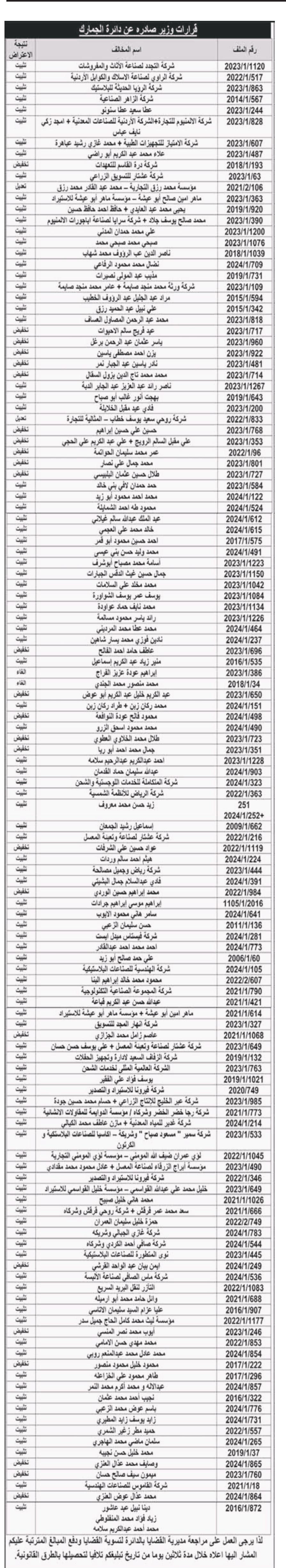 أصدرت دائرة الجمارك، اليوم الثلاثاء، قرارات وزير، وقرارات تغريم وقرارات مطالبة، وفق تاليا التفاصيل: