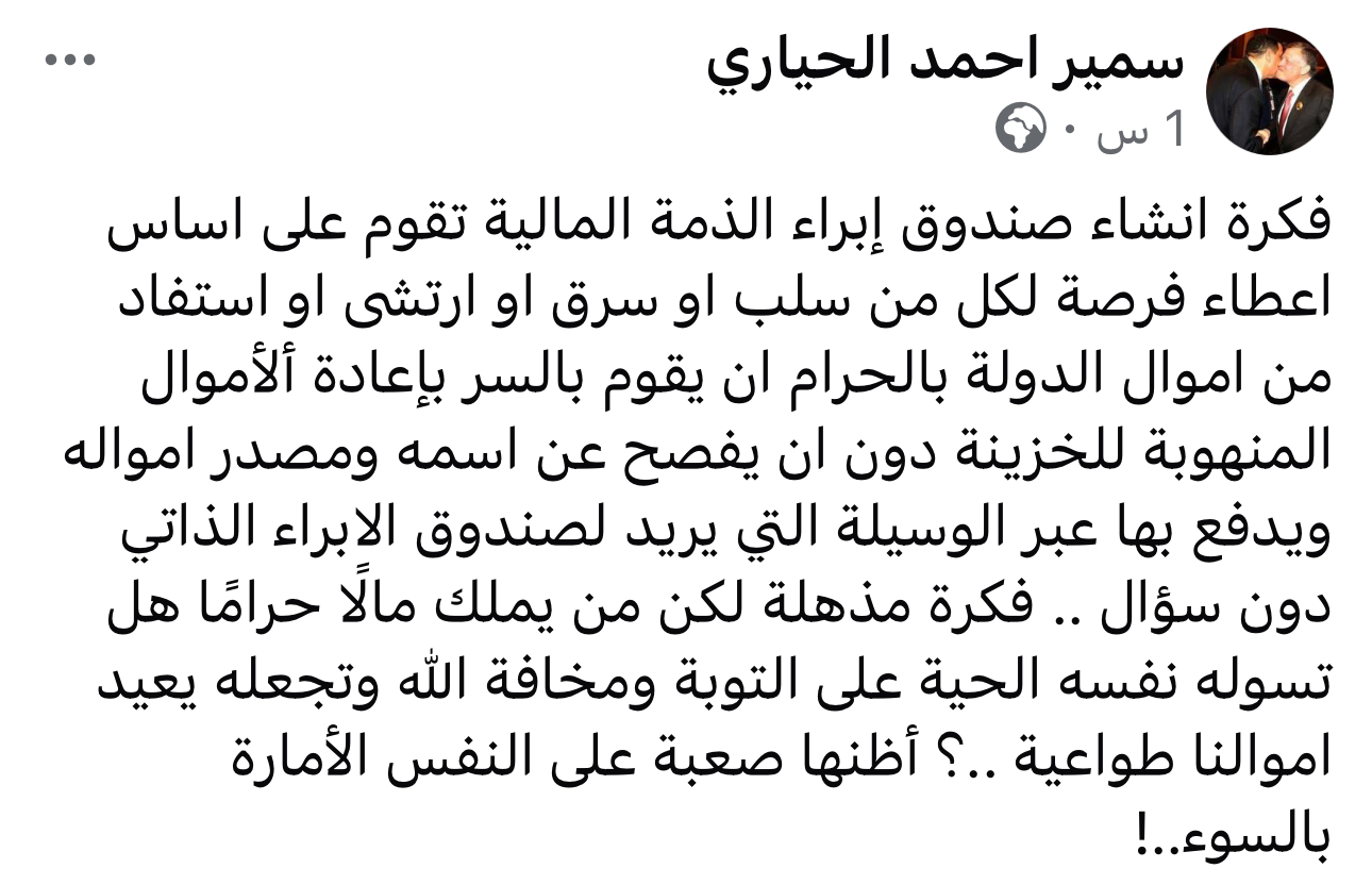 اقترح الصحفي الأردني المخضرم سمير الحياري إنشاء صندوق لإبراء ذمة الفاسدين والمرتشين والمتكسبين من الدولة وقال في ادراج له عبر حسابه الشخصي على موقع التواصل الإجتماعي فيسبوك:-