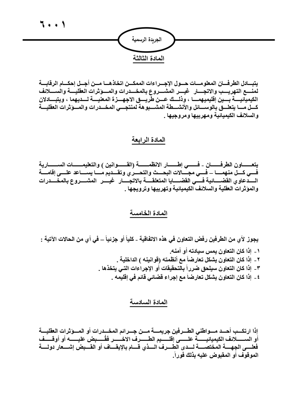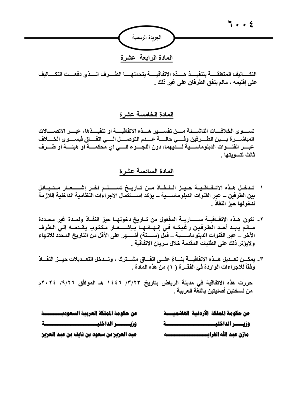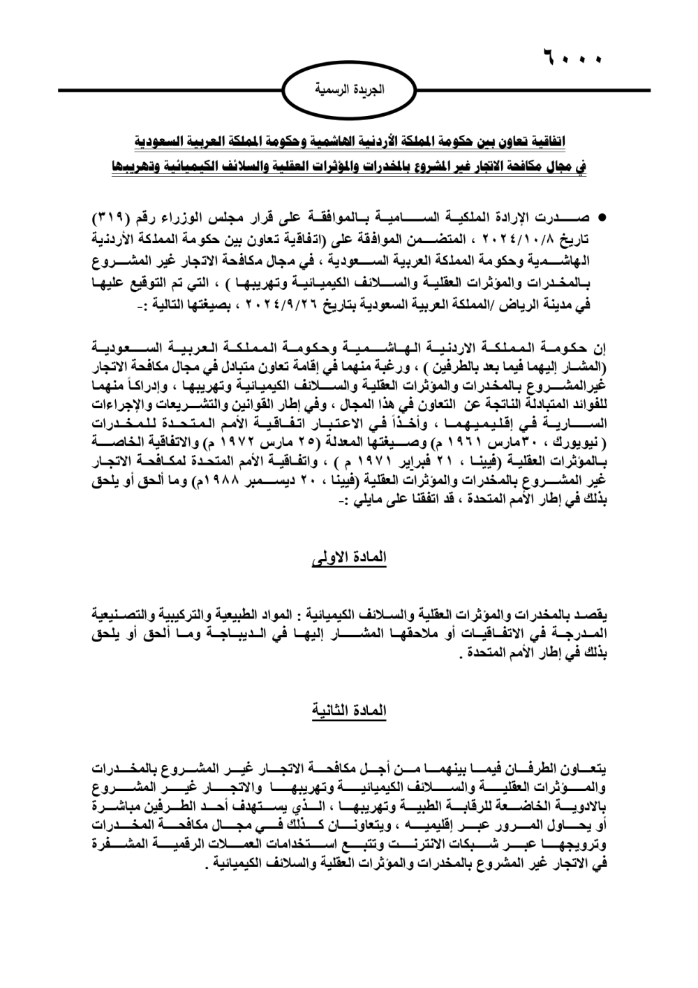 صدر في عدد الجريدة الرسمية، الخميس، نص اتفاقية تعاون بين حكومة المملكة الأردنية الهاشمية وحكومة المملكة العربية السعودية في مجال مكافحة الاتجار غير المشروع بالمخدرات والمؤثرات العقلية والسلائف الكيميائية وتهريبها. وتاليا نص الاتفاقية:
