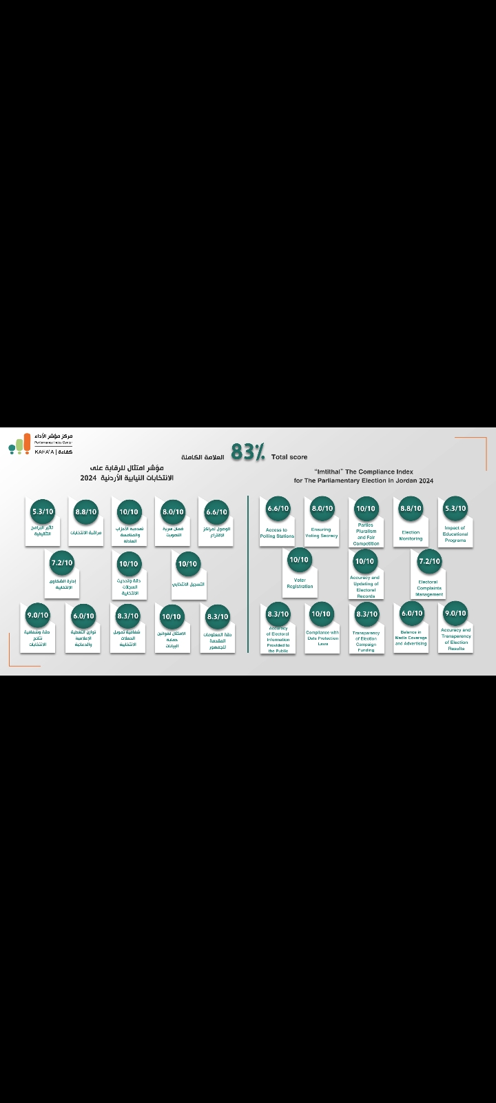 أعلن مركز مؤشر الأداء|كفاءة اليوم الخميس 7/تشرين أول/2024 نتائج مؤشر امتثال 2024 الخاص بالرقابة على الانتخابات النيابية الأردنية.