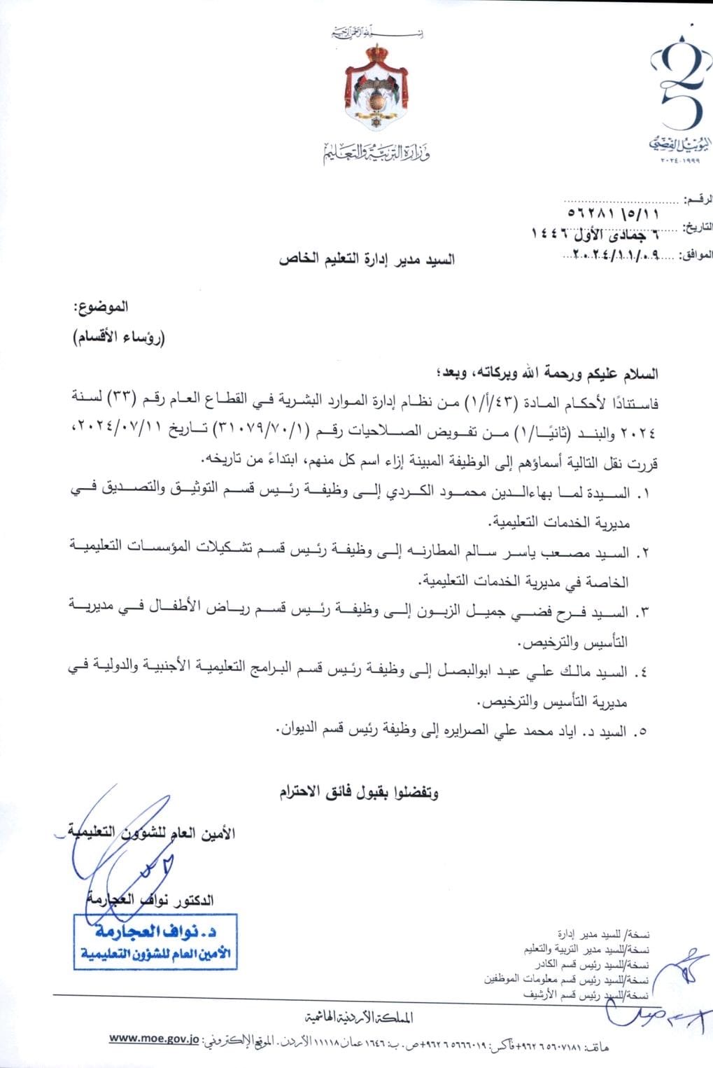 قرر امين عام وزارة التربية والتعليم للشؤون التعليمية الدكتور نواف العجارمة اجراء تشكيلات ادارية في التعليم الخاص للتالية اسماؤهم.