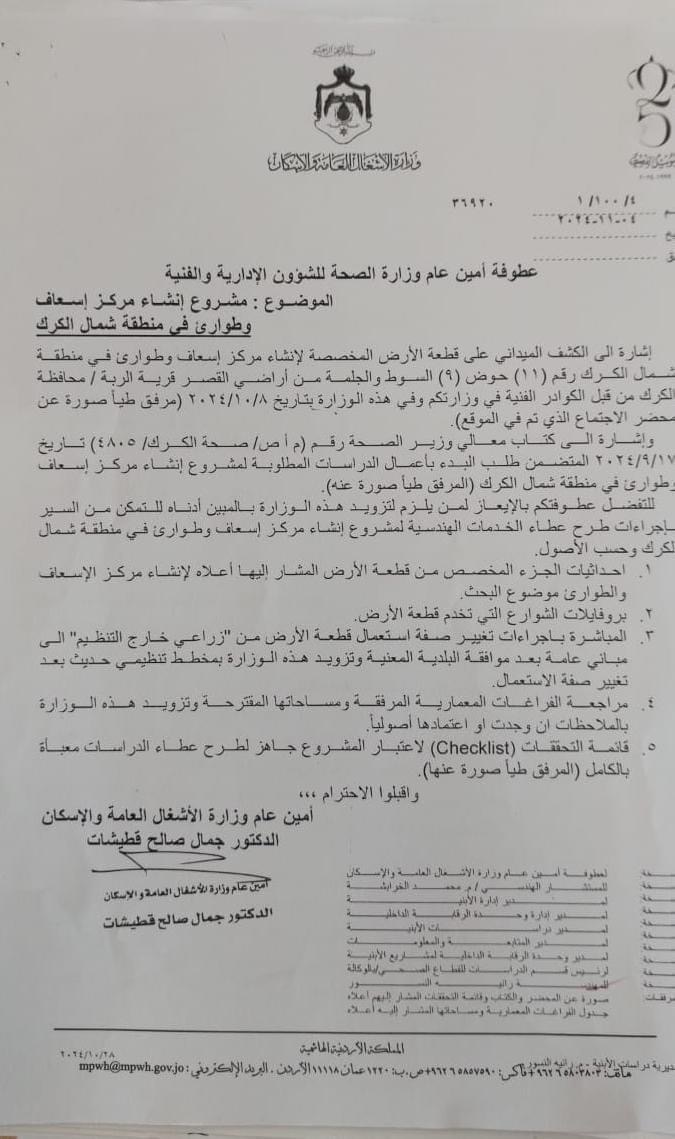 النائب هيثم الزيادين : بدء العمل رسميا بإقامة مركز اسعاف وطوارئ لخدمة اهالي شمال محافظة الكرك ( وثيقة )