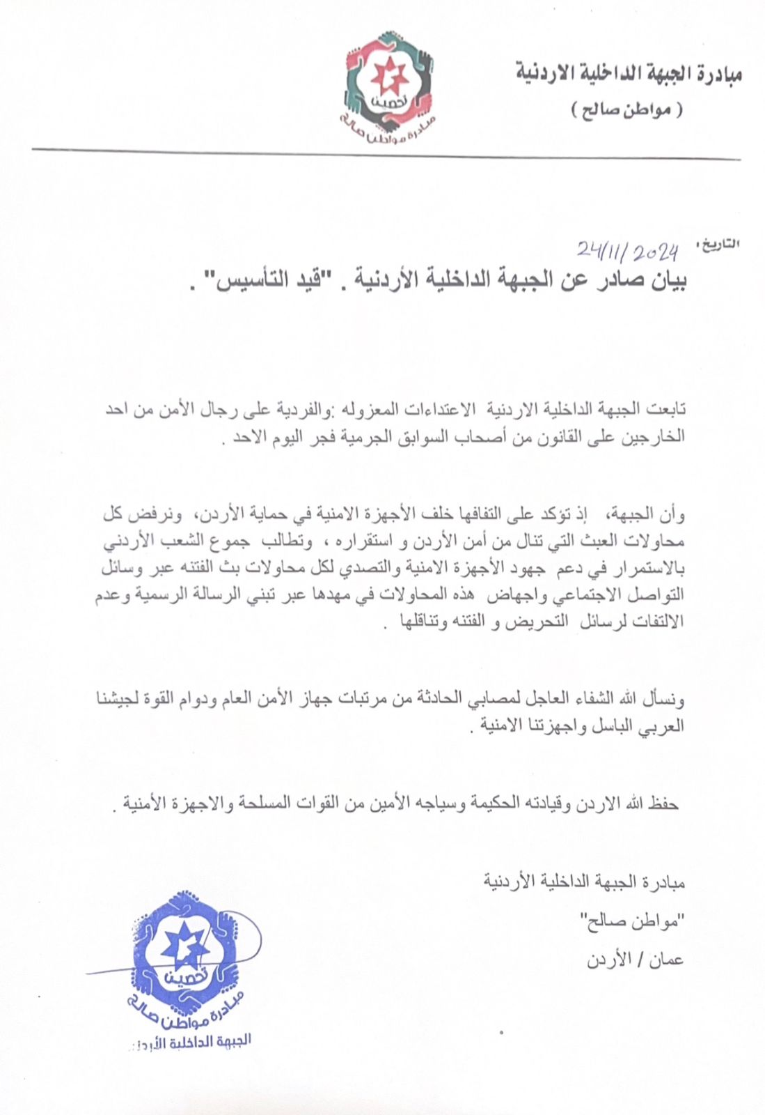 أكدت مبادرة الجبهة الداخلية الأردنية (مواطن صالح) وقوفها خلف الأجهزة الأمنية في حماية الأردن، ورفضت كل محاولات العبث التي تنال من أمن الأردن واستقراره. وطالبت المبادرة، في بيان، "الشعب الأردني بالاستمرار في دعم جهود الأجهزة الأمنية والتصدي لكل محاولات بث الفتنة عبر وسائل التواصل الاجتماعي وإجهاض هذه المحاولات في مهدها عبر تبني الرسالة الرسمية وعدم الالتفات لرسائل التحريض والفتنة وتناقلها". وتاليا نص البيان: