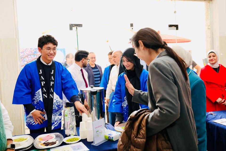 تميزت الفعالية بحضور جماهيري كبير، حيث قدم فريق Historians من طلبة الجامعة عرضاً فريدًا باللغة الإنجليزية عن الثقافة اليابانية، وطرق الترويج للسياحة إلى اليابان، مما أضفى على الحدث طابعًا ثقافيًا وتعليميًا رائعاً. لكن الحدث لم يقتصر على العروض التقديمية فقط! فقد غمرت الأنشطة التفاعلية الزوار بكل ما هو مميز، بدءًا من التعرف على العادات والتقاليد اليابانية، وصولًا إلى تجربة الكتابة بالخط الياباني الرائع. وكان للحضور فرصة لاكتشاف طقوس الشاي الياباني، والتلذذ بمذاق الأطعمة اليابانية التقليدية، إضافة إلى استعراض الفرص المذهلة للمنح الدراسية والتبادل الثقافي في اليابان.