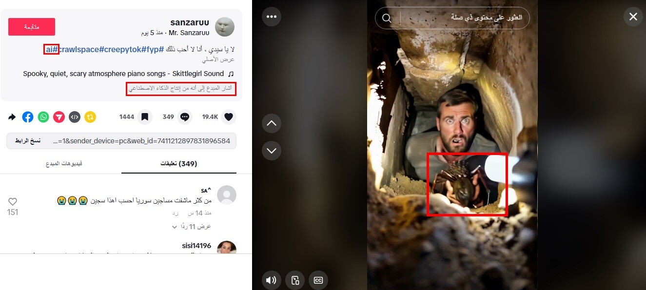 ويظهر في المقطع شاب يخرج من حفرة تحت الأرض، ممسكًا بعنكبوت ضخم في يده. وأشار الحساب إلى أنّ الفيديو مولد بالذكاء الاصطناعي.