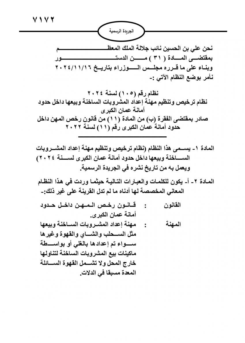 صدر في عدد الجريدة الرسمية اليوم الاثنين، نظام ترخيص وتنظيم مهنة إعداد المشروبات الساخنة وبيعها داخل حدود أمانة عمان الكبرى.واشترط النظام الجديد أن يكون المبنى انشائيا حاصلا على إذن اشغال، وأن يكون العاملين فيه فوق سن 18 عاما.ومنع النظام وقوف العاملين في بيع القهوة والمشروبات خارج المحل لغايات ممارسة المهنة وتوصيل الطلبات للشارع العام.كما منع استخدام الرصيف وحجز مواقف الشارع العام امام المحل.وتاليا النظام الجديد: