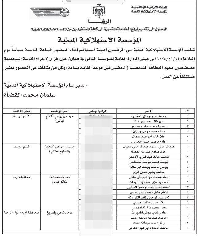 بالأسماء .. الاستهلاكية المدنية تدعو مرشحين للمقابلة الشخصية