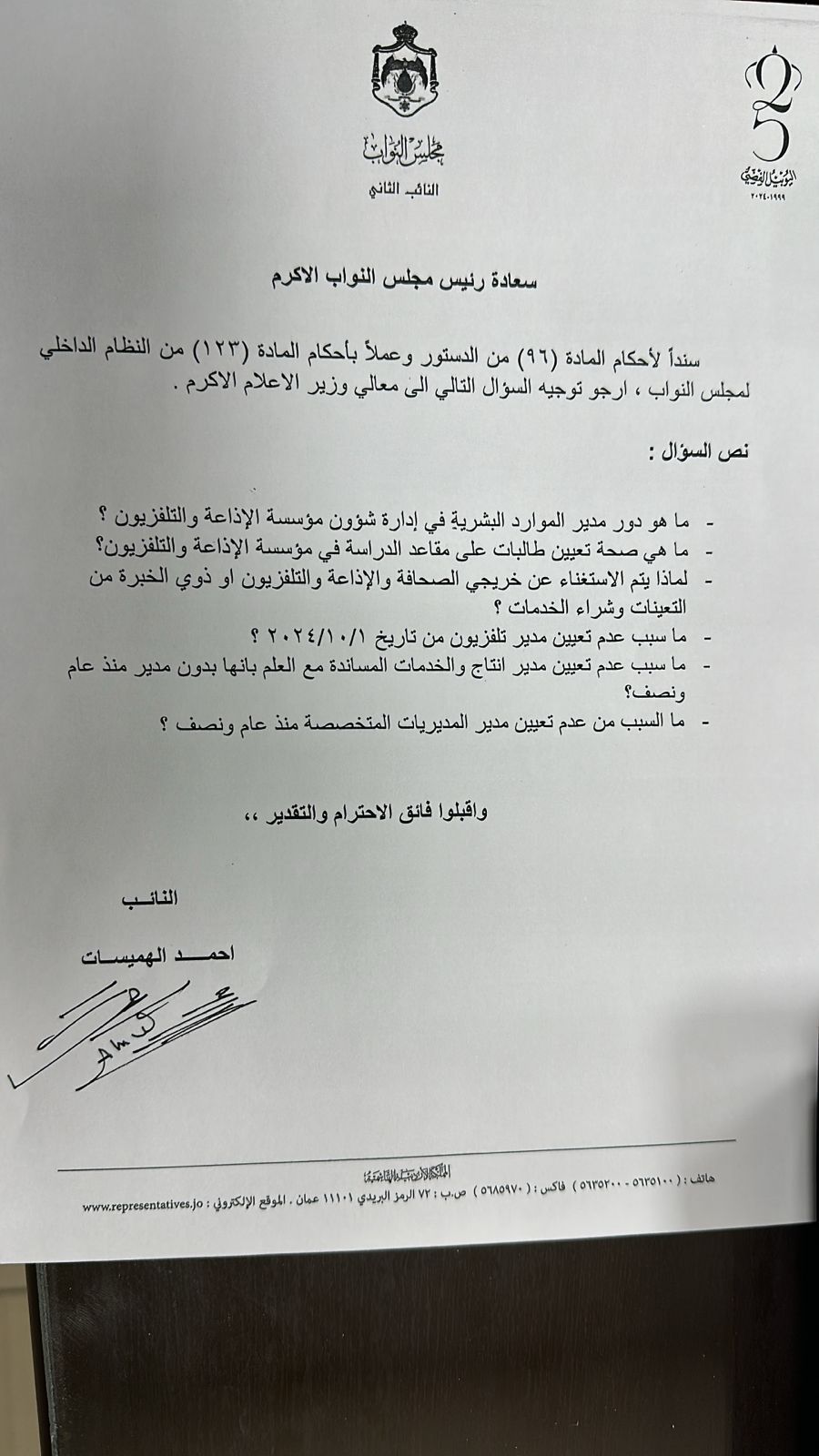 وجه النائب أحمد الهميسات سؤالاً نيابياً لوزير الإعلام تضمنت عدة محاور حول التلفزيون الأردني وآليات عمل ومدراءه.