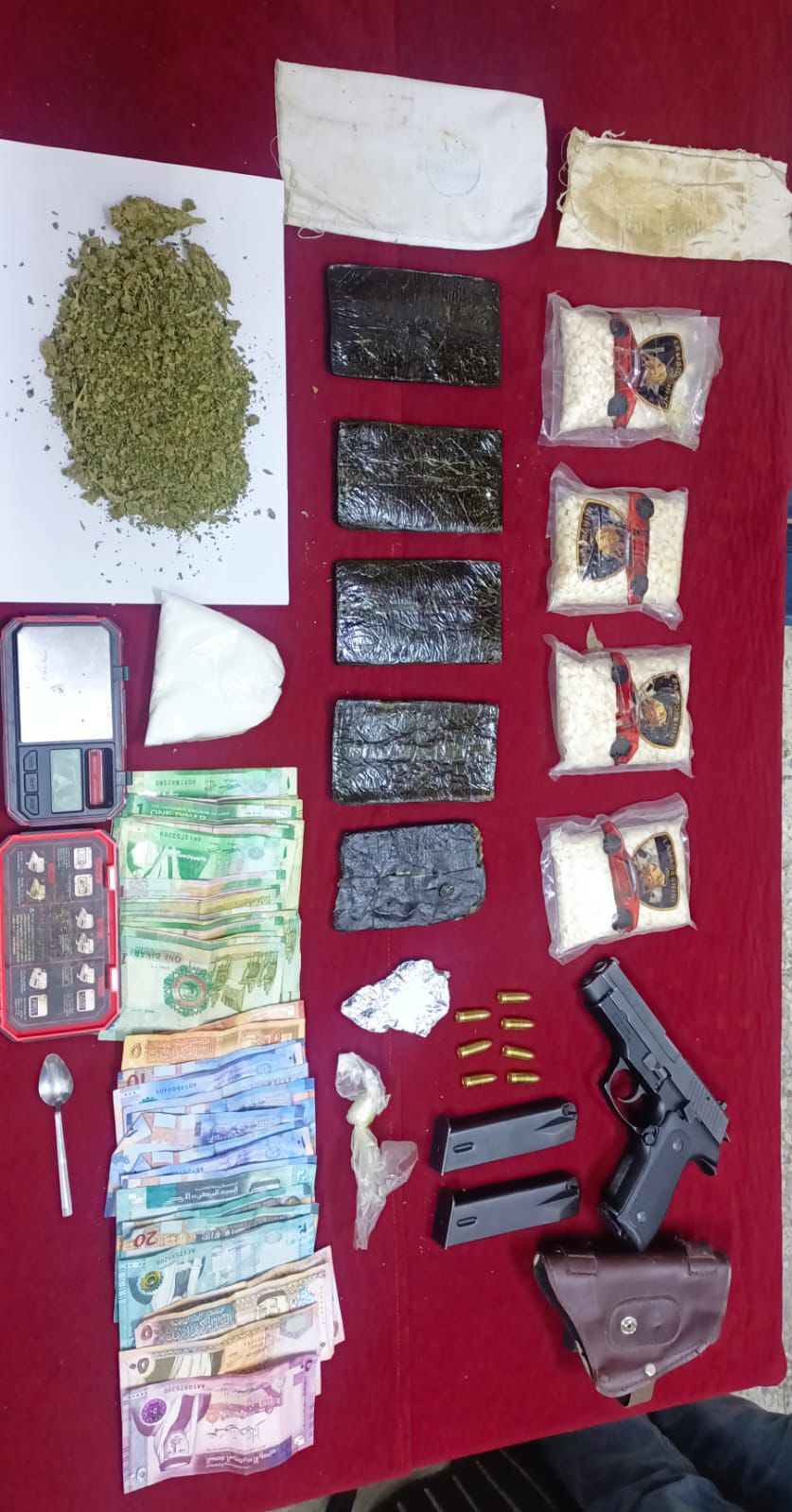 وفي غرب البلقاء دوهم تاجر للمخدرات بعد أن ألقي القبض على ثلاثة مروجين يقومون بالعمل لصالحه بترويج وبيع المخدارت وضبط بحوزته 4000 حبة مخدرة و 5 كفوف حشيش كما وتم في قضية أخرى في غرب البلقاء تحديد مكان وجود مطلوب بقضايا المخدرات ومصنف بالخطر والمسلح، وجرت مداهمته وإلقاء القبض عليه وضُبط بحوزته سلاح ناري.