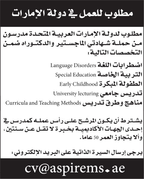 أعلنت جهة أكاديمية في دولة الإمارات العربية المتحدة عن حاجتها لمدرسين من حملة شهادتي الماجستير والدكتوراة في التخصصات التالية: اضطرابات اللغة (Language Disorders) التربية الخاصة (Special Education) الطفولة المبكرة (Early Childhood) التدريس الجامعي (University Lecturing) المناهج وطرق التدريس (Curricula and Teaching Methods) الشروط المطلوبة أن يكون المرشح على رأس عمله كمدرس في مؤسسة أكاديمية مع خبرة لا تقل عن سنتين.