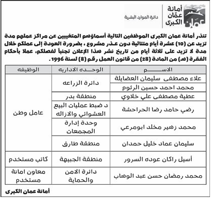 انذرت امانة عمان عدد من موظفيها بالعودة الى عملهم خلال مدة لا تزيد عن 3 ايام من تاريخ هذا الاعلان والا سيتم فصلهم وفقا لاحكام القانون