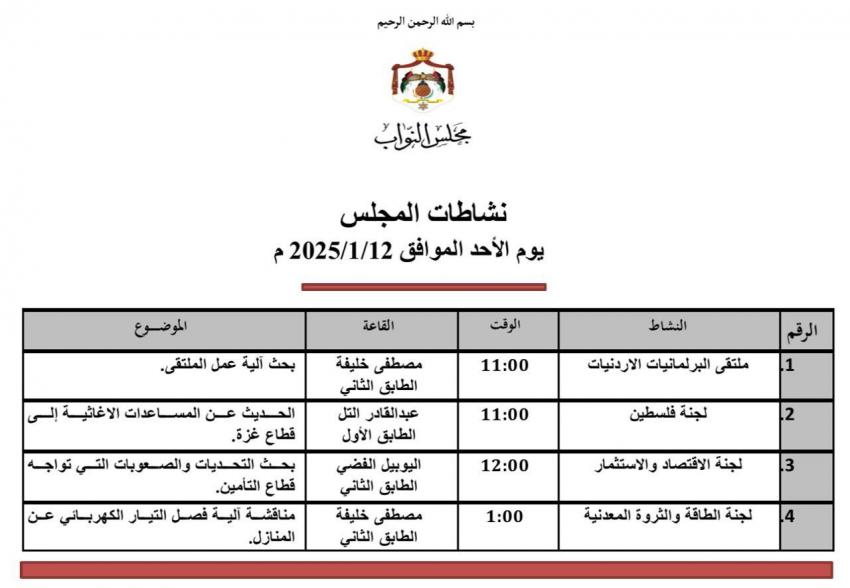 يأتي هذا في ظل الظروف الصعبة التي يعيشها أهالي القطاع، وبهدف تعزيز الجهود الأردنية الداعمة للفلسطينيين. على صعيد آخر، يعقد ملتقى البرلمانيات الأردنيات اجتماعًا لبحث آليات العمل الخاصة بالملتقى، بما يعزز دور المرأة في الحياة السياسية ويزيد من فاعلية مساهمتها في العمل البرلماني.