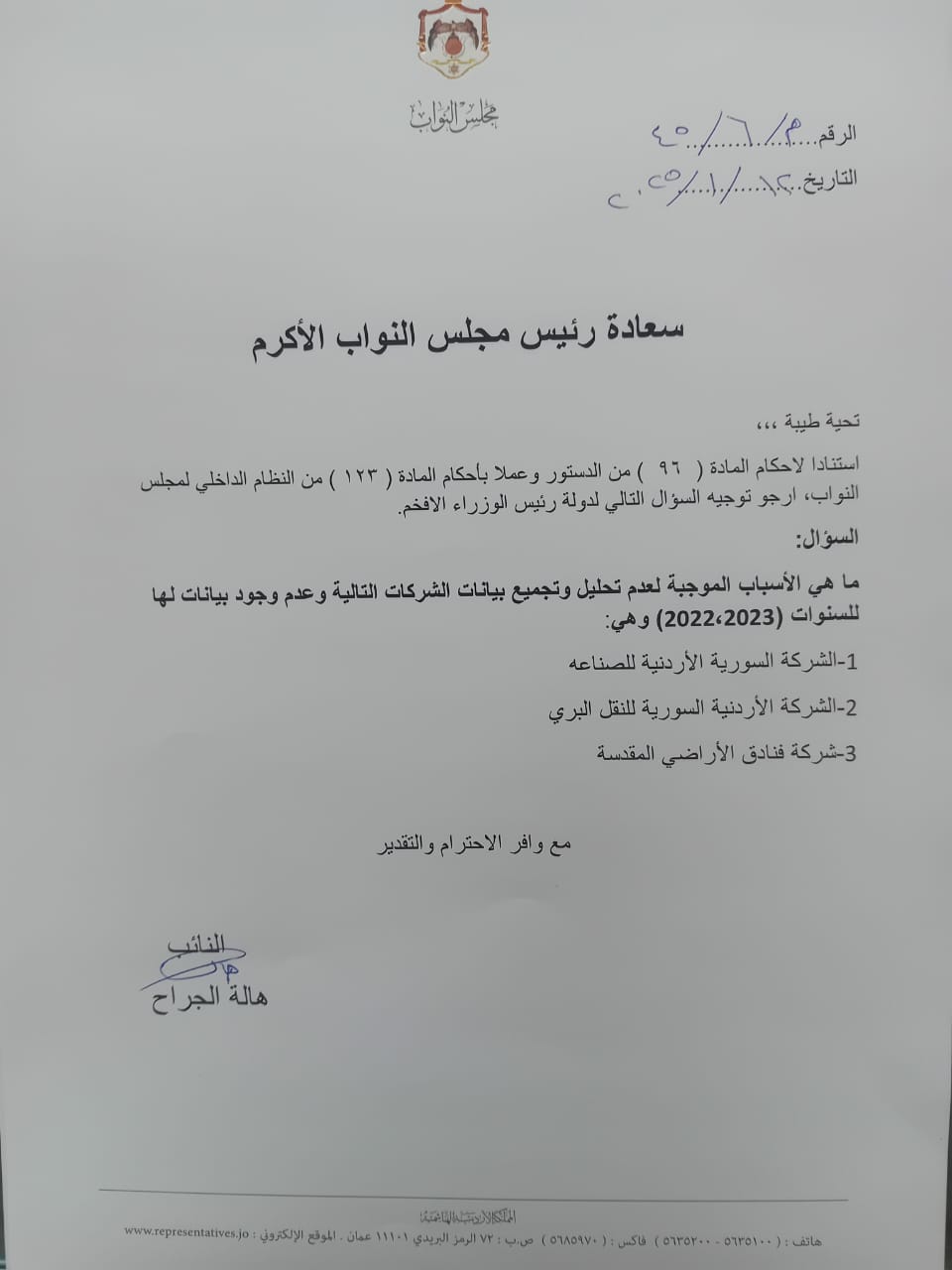 استنادا لأحكام المادة (96) من الدستور وعملا بأحكام المادة (123) من النظام الداخلي لمجلس النواب ارجو توجيه الأسئلة التالية إلى معالي رئيس الوزراء، ووزير المالية.