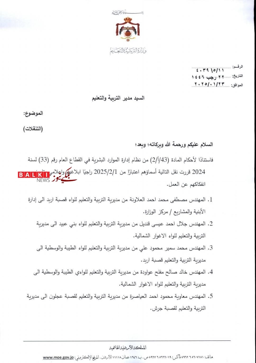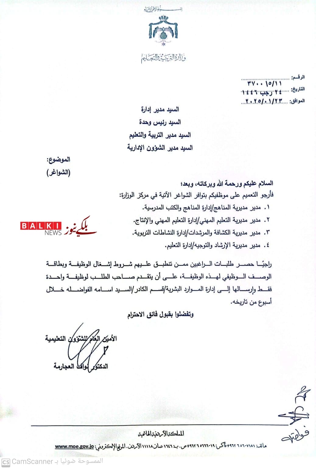 وزارة التربية تعلن عن شواغر وتنقلات داخلية ( وثيقة )