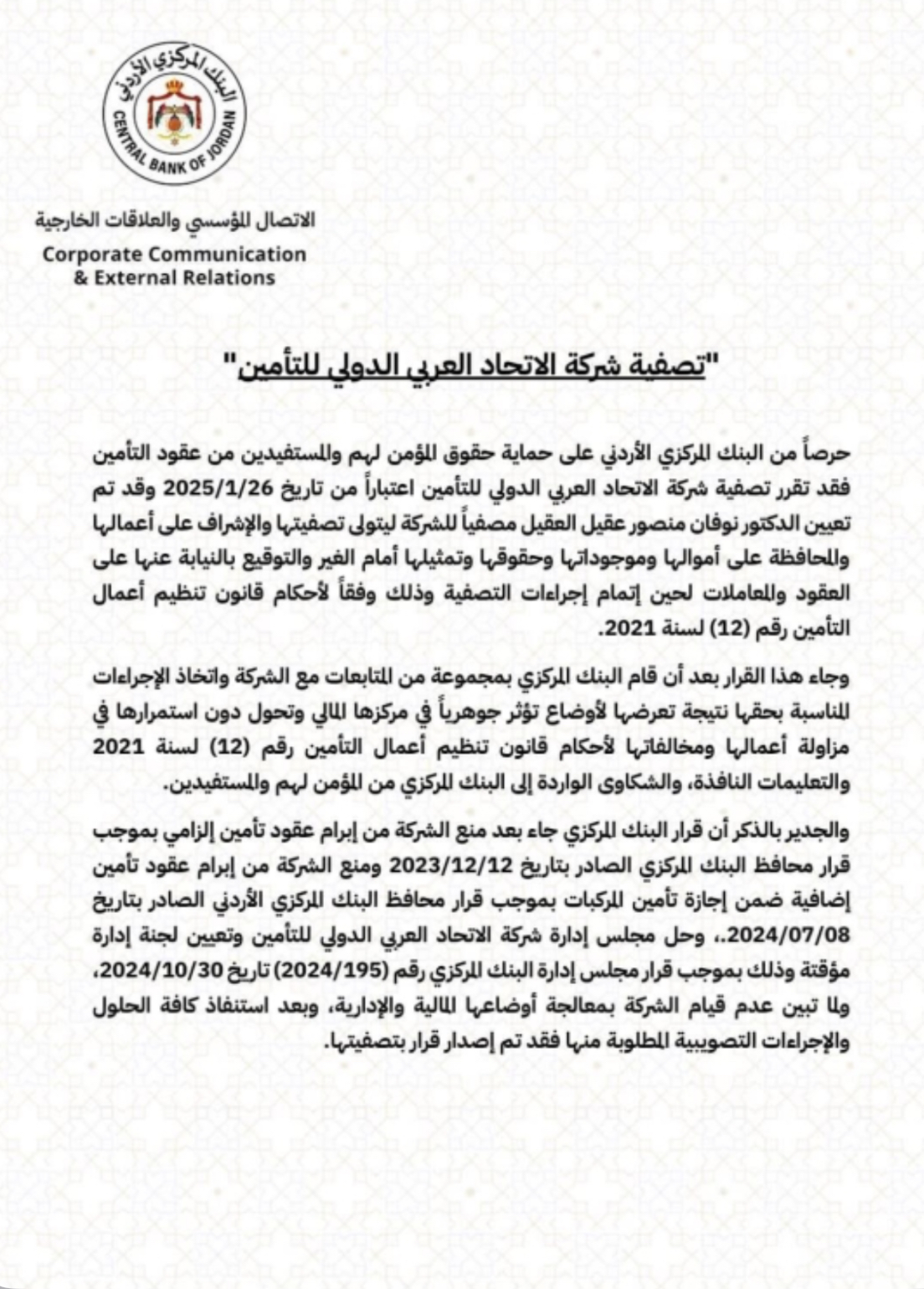الجدير بالذكر أن قرار البنك المركزي جاء بعد منع الشركة من إبرام عقود تأمين إلزامي بموجب قرار محافظ البنك المركزي الصادر بتاريخ 2023/12/12 ومنع الشركة من إبرام عقود تأمين إضافية ضمن إجازة تأمين المركبات بموجب قرار محافظ البنك المركزي الأردني الصادر بتاريخ 2024/07/08، وحل مجلس إدارة شركة الاتحاد العربي الدولي للتأمين وتعيين لجنة إدارة مؤقتة وذلك بموجب قرار مجلس إدارة البنك المركزي رقم (2024/195) تاریخ 2024/10/30 ولا تبين عدم قيام الشركة بمعالجة أوضاعها المالية والإدارية، وبعد استنفاذ كافة الحلول والإجراءات التصويبية المطلوبة منها فقد تم إصدار قرار بتصفيتها.