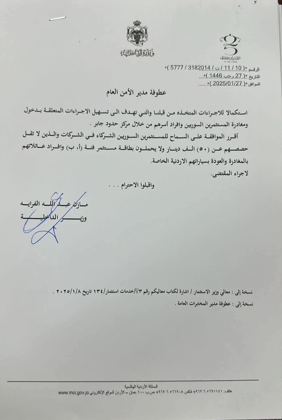 عمان، الأردن - أصدر وزير الداخلية مازن الفراية تعميماً يقضي بالسماح للمستثمرين السوريين بدخول الأردن والمغادرة منه عبر معبر جابر الحدودي مع سوريا، وذلك باستخدام مركباتهم الخاصة.