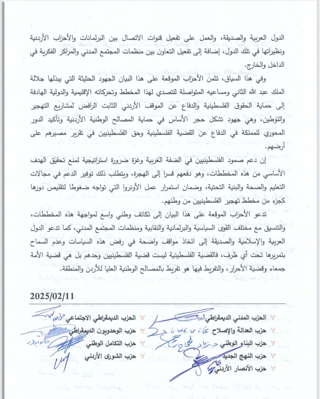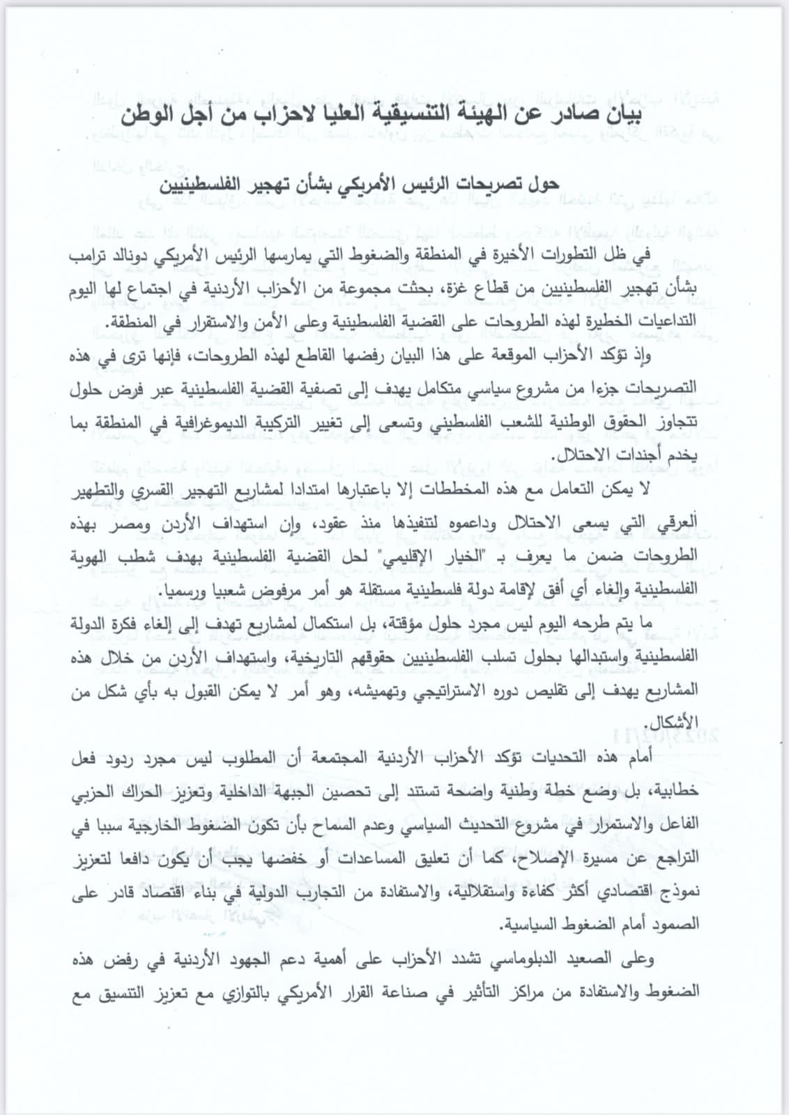 أعلنت الهيئة التنسيقية العليا لأحزاب من أجل الوطن والتي تشكلت من ٩ أحزاب أردنيه بداية هذا العام إنطلاق أعمالها في إجتماعها الذي عقد مساء هذا اليوم الثلاثاء .حيث ترافق الإعلان عن الهيئة مع تنفيذ وقفة لامناء عامين الأحزاب التي تشكل هذه الهيئة لدعم الموقف الوطني الرافض لمشروع التهجير والاعلان عن الوقوف صفا واحدا خلف قيادتنا الهاشميه وإصدار بيان بهذا الخصوص. حيث تزامن ذلك مع زيارة جلالة الملك للولايات المتحدة وإجتماعه مع الرئيس الأمريكي ترامب الله كما تم الإتفاق على وضع خطة قانونية لمواجهة قضية التهجير.ومن الجدير بالذكر ان الهيئة التنسيقة العليا لأحزاب من أجل الوطن تشكلت على فكرة العمل الحزبي التشاركي للوصول لتحالفات دائمة بين أعضاء الهيئة.كما سيكون هناك خطة عمل مشتركة لأعضاء الهيئة تعالج عدد من التحديات التي تواجه العمل الحزبي وتخلق فرص لشراكة فاعلة ومستدامه._مرفقا البيان الصادر عن الهيئة التنسيقية العليا لأحزاب من أجل الوطنصادر عن الهيئة التنسيقيه العليا لأحزاب من أجل الوطن ..الثلاثاء ١١شباط٢٠٢٥
