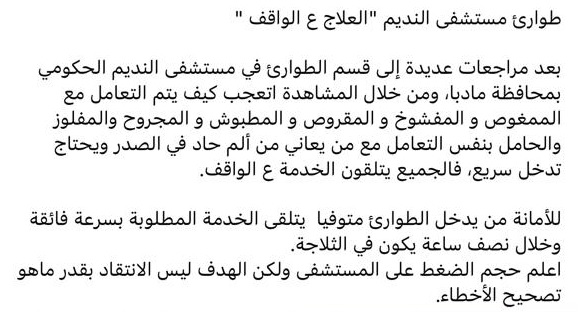 يعاني العديد من المواطنين الذين يراجعون قسم الطوارئ في مستشفى النديم الحكومي من تكدس كبير في الأعداد، ما يؤدي إلى تقديم الخدمة بشكل فوضوي، حيث يتلقى الجميع العلاج "على الواقف" دون تمييز بين الحالات الحرجة والبسيطة. ويُستغرب من قبل البعض كيف يُعامل المرضى الذين يعانون من آلام حادة في الصدر، والتي تتطلب تدخلًا سريعًا، بنفس الطريقة التي يتم بها التعامل مع الحالات الأقل خطورة. وكتب أحد المواطنين: "اتعجب كيف يتم التعامل مع الممغوص والمفشوخ و المقروص والمطبوش والمجروح والمفلوز والحامل بنفس التعامل مع من يعاني من ألم حاد في الصدر ويحتاج تدخل سريع، فالجميع يتلقون الخدمة ع الواقف". وأضاف: "للأمانة من يدخل الطوارئ متوفيا يتلقى الخدمة المطلوبة بسرعة فائقة وخلال نصف ساعة يكون في الثلاجة". ورغم الضغط الكبير الذي يعاني منه المستشفى، أكد المواطن أن الهدف من نشر هذه الملاحظات ليس الانتقاد، بل تصحيح الأخطاء وتحسين مستوى الخدمة المقدمة للمراجعين.