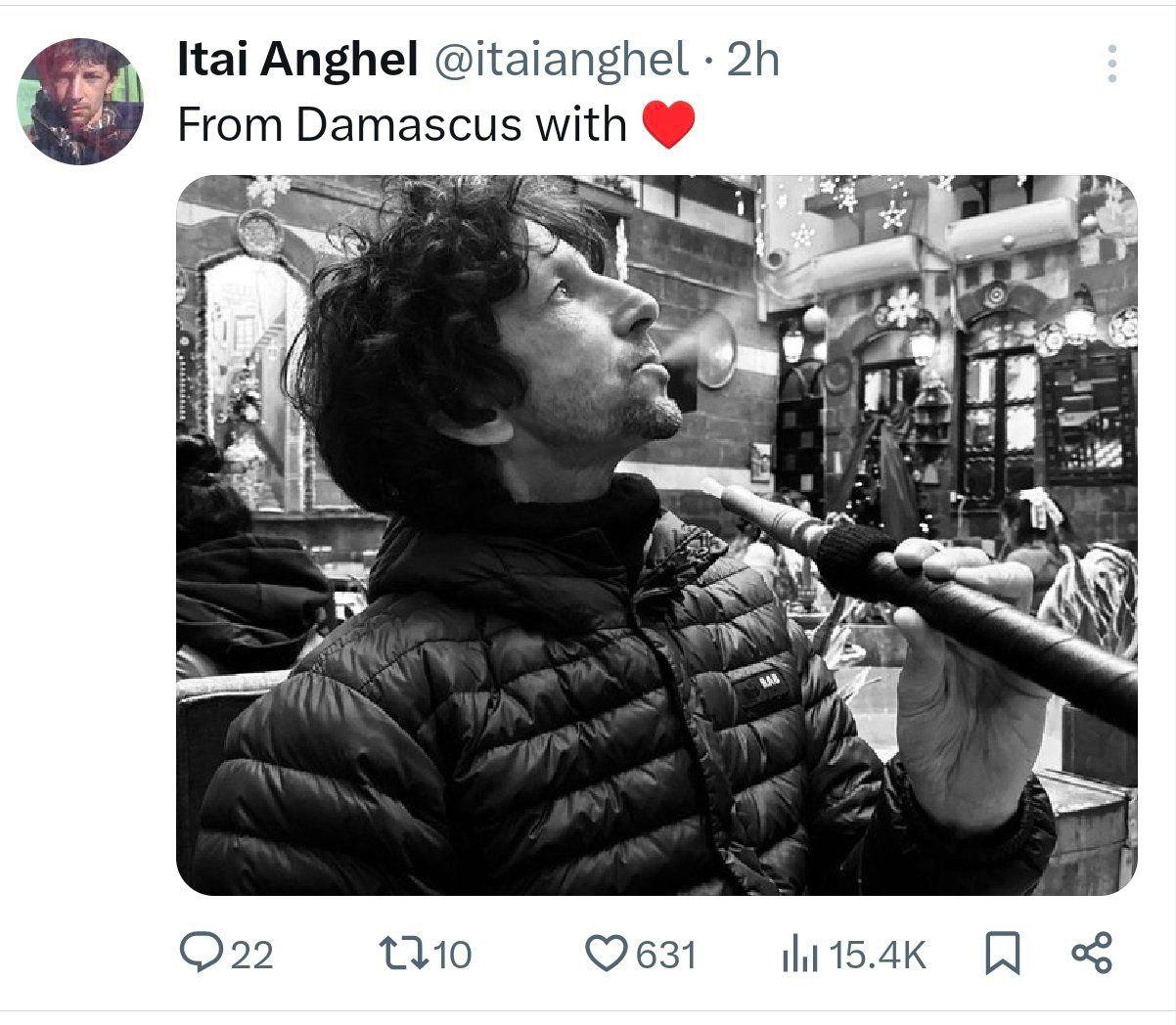 نشر صحافي إسرائيلي يُدعى إيتاي أنغل صورة له وهو يدخّن النرجيلة في دمشق.