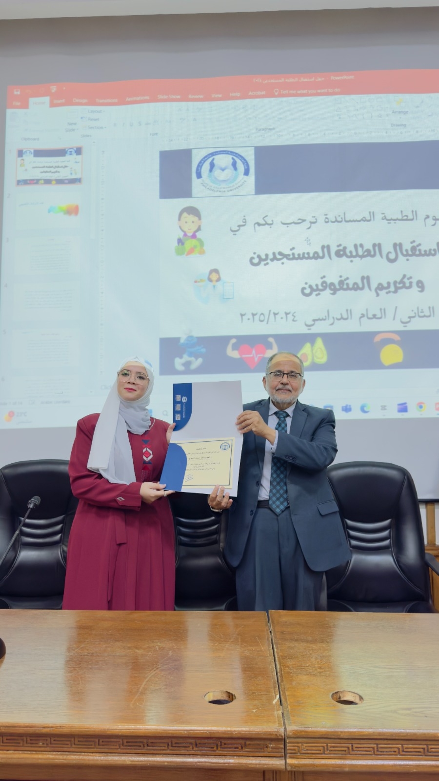 وفي لفتة تحفيزية، كرَّم الأستاذ الدكتور فؤاد عبد الله نخبة من الطلبة المتفوقين من قسمي العلاج الطبيعي والتغذية السريرية والحميات، تقديرًا لتفوقهم الأكاديمي، وتشجيعًا للطلبة الجدد على الاقتداء بهم والسير على نهجهم.