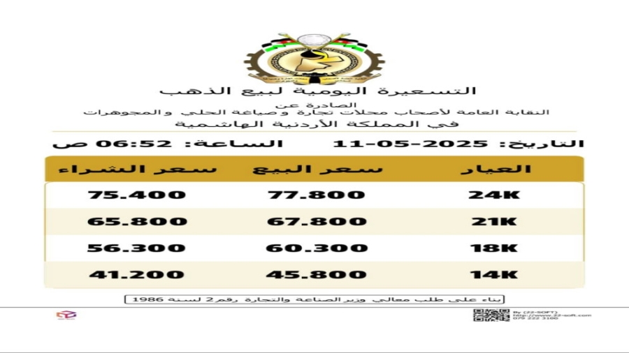 وسجّل سعر غرام الذهب من عيار 21، الأكثر طلبًا من المواطنين، 67.80 دينارًا لغايات البيع لدى محالّ الصاغة، مقابل 65.80 دينارًا لغايات الشراء.
