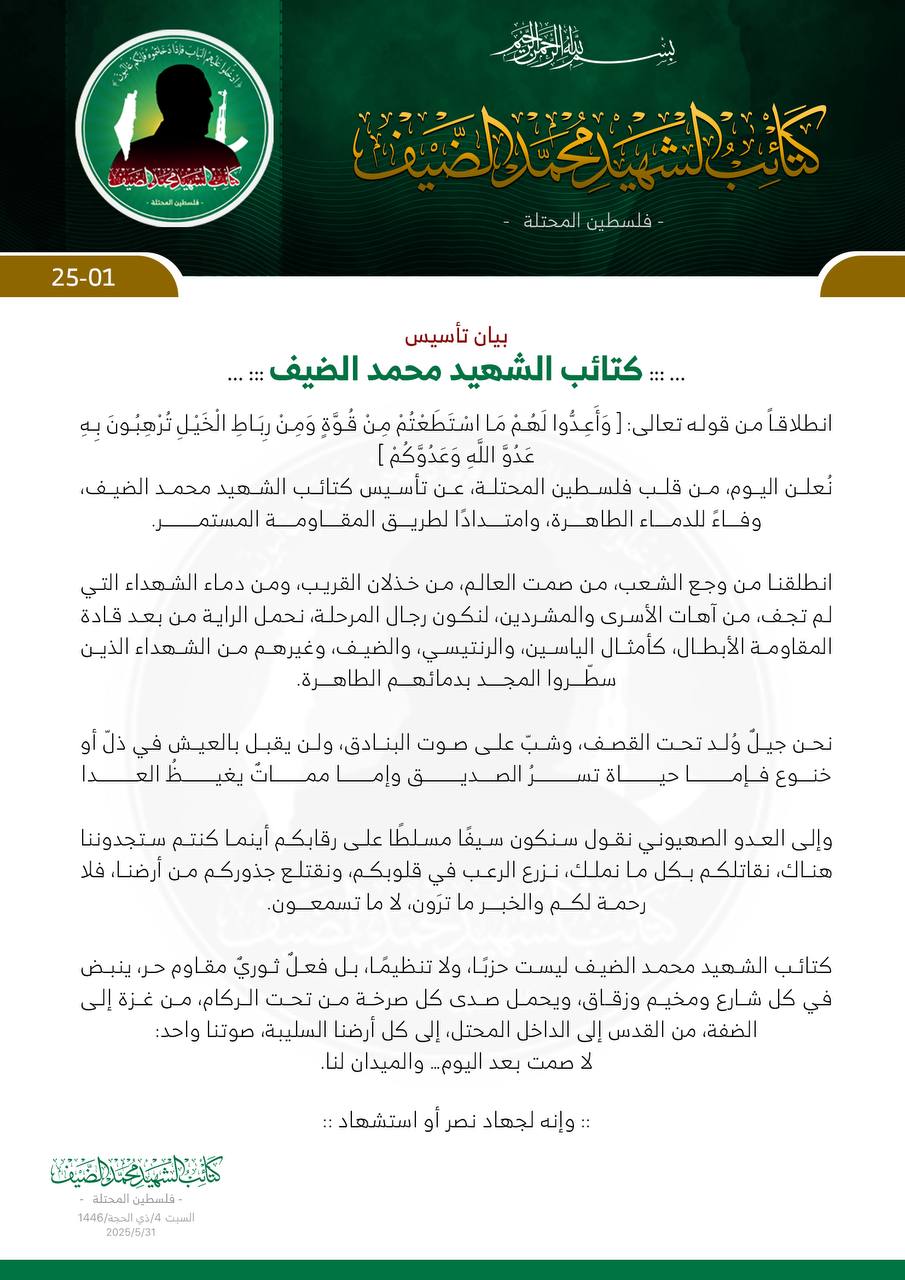 أعلنت مجموعة مقاومة فلسطينية، نهاية الشهر الماضي، عن تأسيس “كتائب الشهيد محمد الضيف”، مؤكدة أن انطلاقتها تأتي وفاءً لدماء الشهداء، وامتدادًا لنهج المقاومة المستمر ضد الاحتلال الصهيوني.