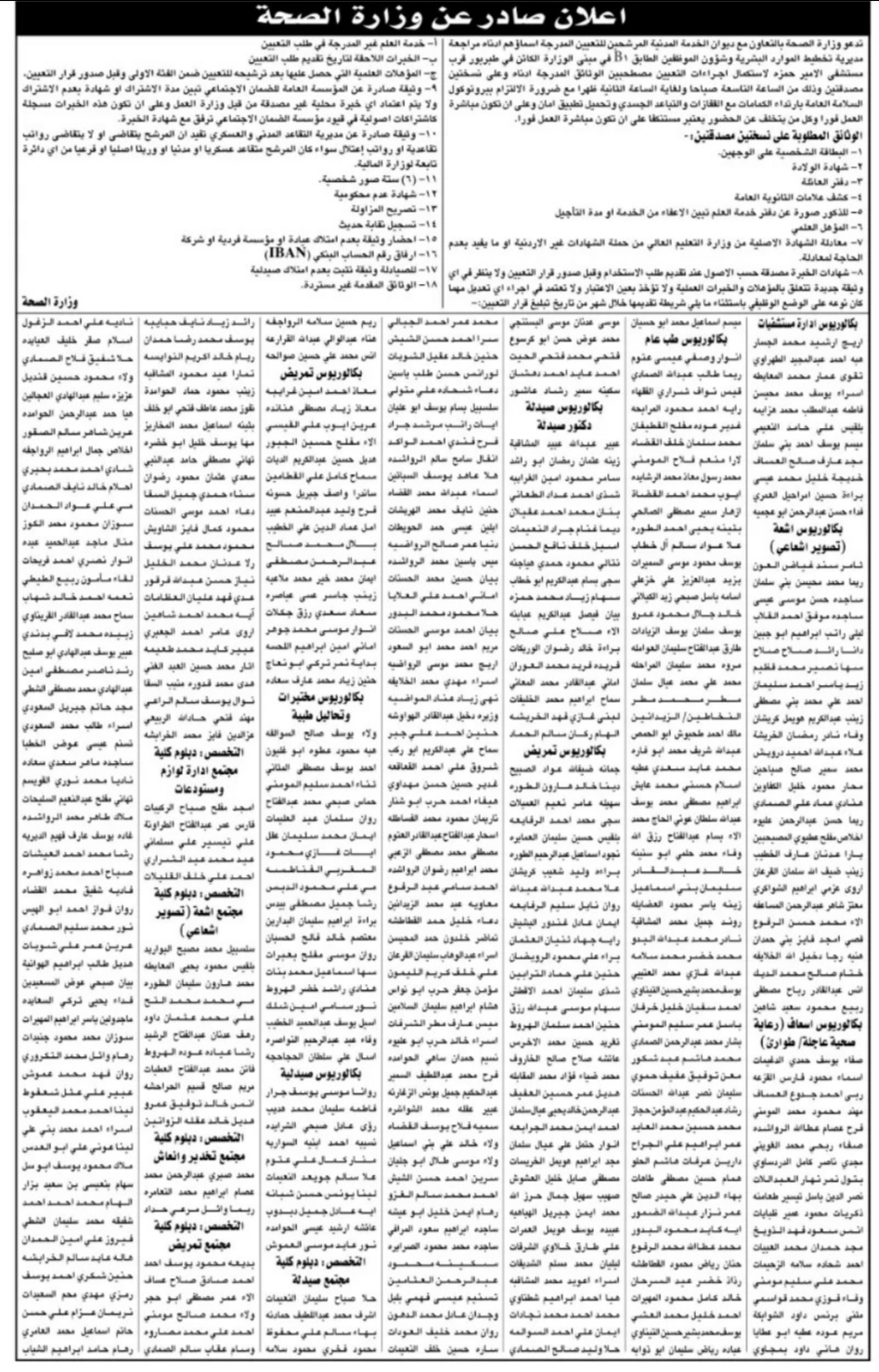 دعت وزارة الصحة بالتعاون مع ديوان الخدمة المدنية المرشحين، مراجعة مديرية تخطيط الموارد البشرية وشؤون الموظفين، لاستكمال إجراءات التعيين.