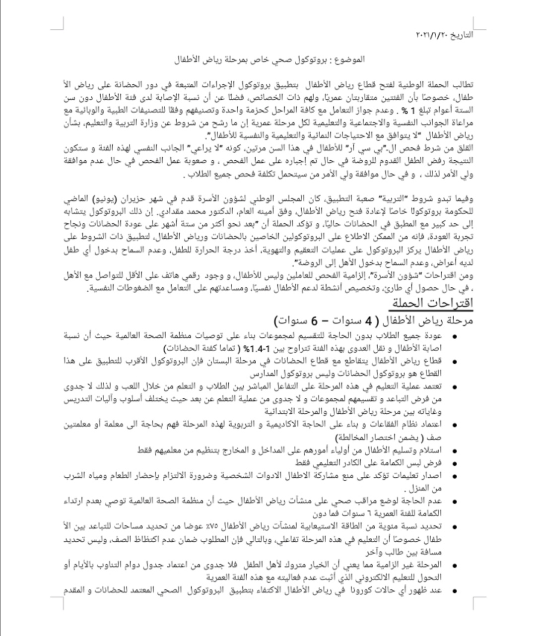 تطالب الحملة الوطنية لفتح قطاع رياض الأطفال بتطبيق بروتوكول الإجراءات المتبعة في دور الحضانة على رياض الأطفال، خصوصًا بأن الفئتين متقاربتان عمريًا، ولهم ذات الخصائص، فضلًا عن أن نسبة الإصابة لدى فئة الأطفال دون سن الستة أعوام تبلغ 1 % . وعدم جواز التعامل مع كافة المراحل كحزمة واحدة وتصنيفهم وفقًا للتصنيفات الطبية والوبائية مع مراعاة الجوانب النفسية والاجتماعية والتعليمية لكل مرحلة عمرية إن ما رشح من شروط عن وزارة التربية والتعليم، بشأن رياض الأطفال “لا يتوافق مع الاحتياجات النمائية والتعليمية والنفسية للأطفال”.