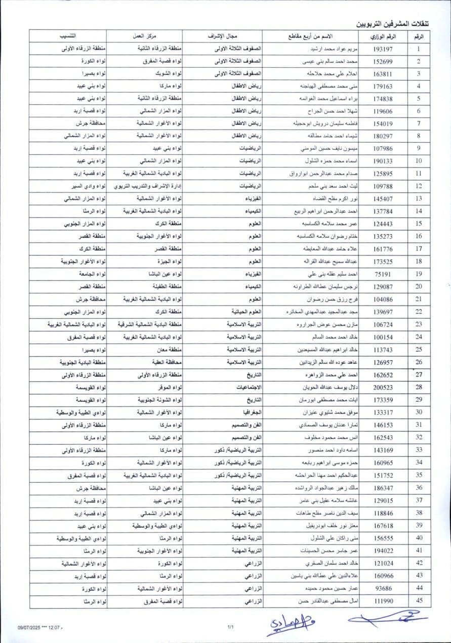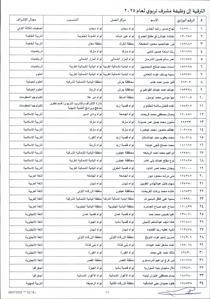 عمان – أعلنت وزارة التربية والتعليم عن صدور قرارات بترقية كوكبة من الكفاءات التربوية المتميزة إلى وظيفة مشرف تربوي وأخصائي مبحث، وذلك في خطوة تهدف إلى تعزيز الكوادر الإشرافية في الميدان التربوي والارتقاء بجودة العملية التعليمية.
