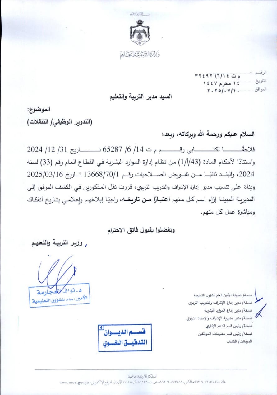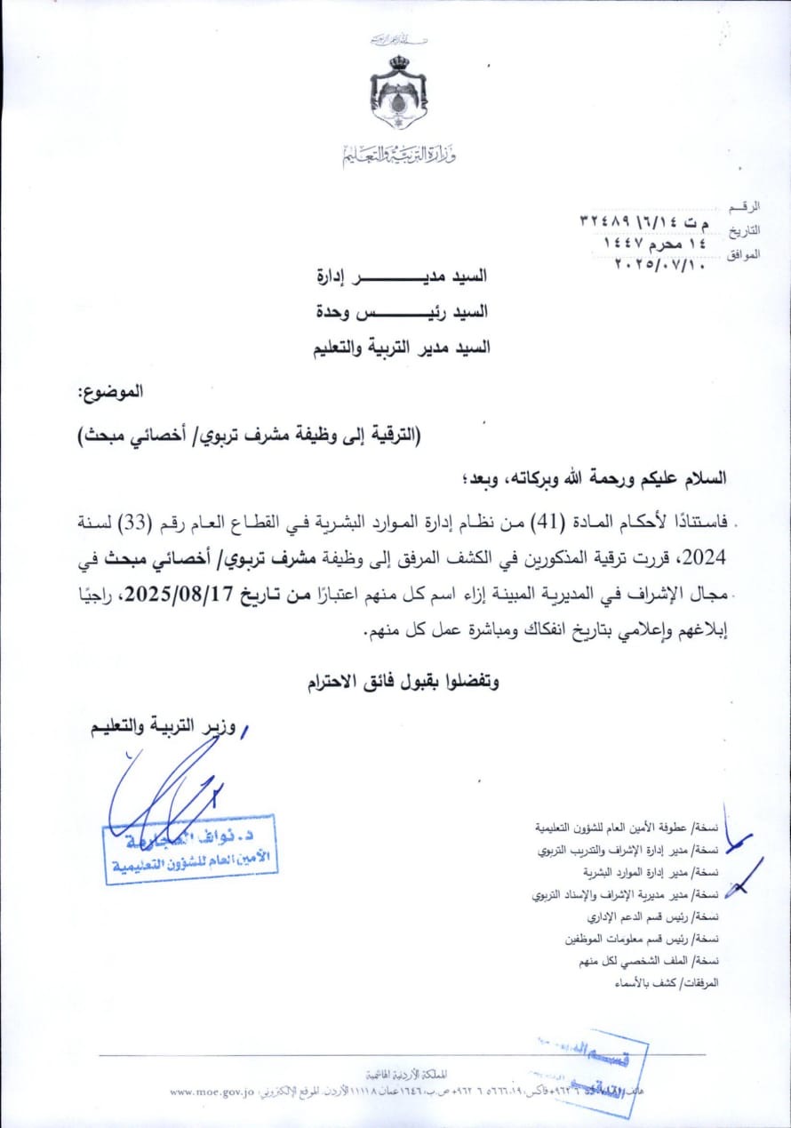 وزارة التربية والتعليم تعلن عن ترقية دفعة جديدة من الكفاءات إلى وظيفة مشرف تربوي وأخصائي مبحث (اسماء )
