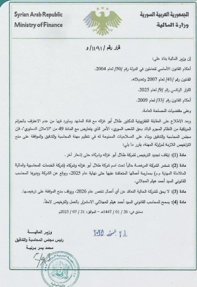 خاص- أصدر وزير المالية في الجمهورية العربية السورية، الدكتور محمد يسر برنية، اليوم، قراراً حمل الرقم 1191/و، يقضي بإيقاف تجديد الترخيص لـ "شركة طلال أبو غزالة وشركاه" حتى إشعار آخر.