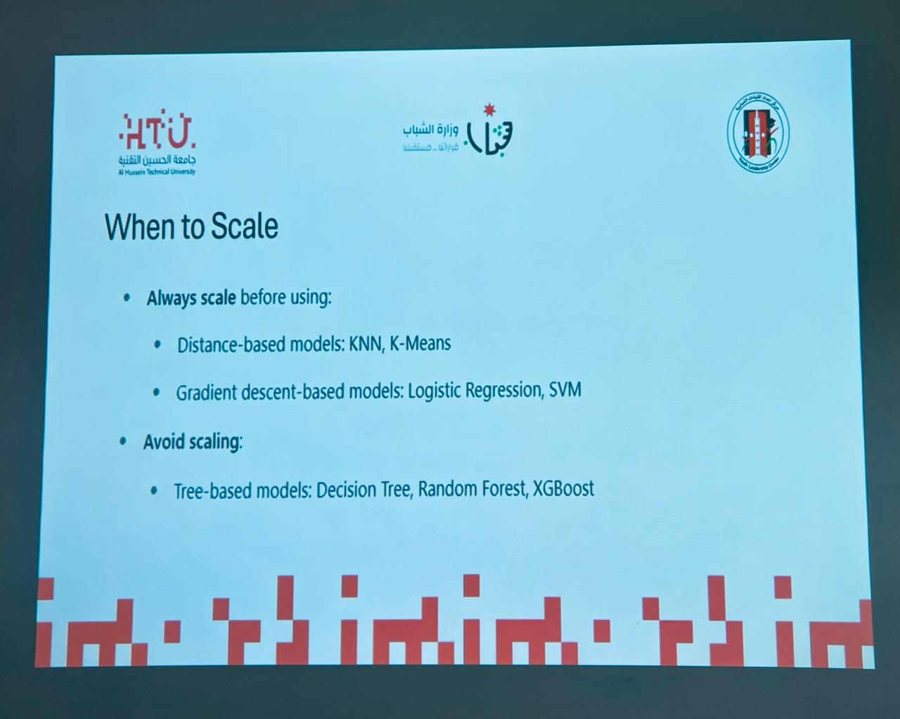 اشتملت الجلسات على تدريبات عملية في تنظيف وتجهيز البيانات، التحليل الاستكشافي، التحليل المرئي، وهندسة الخصائص، إلى جانب تمارين تطبيقية في التفكير التصميمي، تحليل المشكلات، وبناء الشخصية الشرائية.