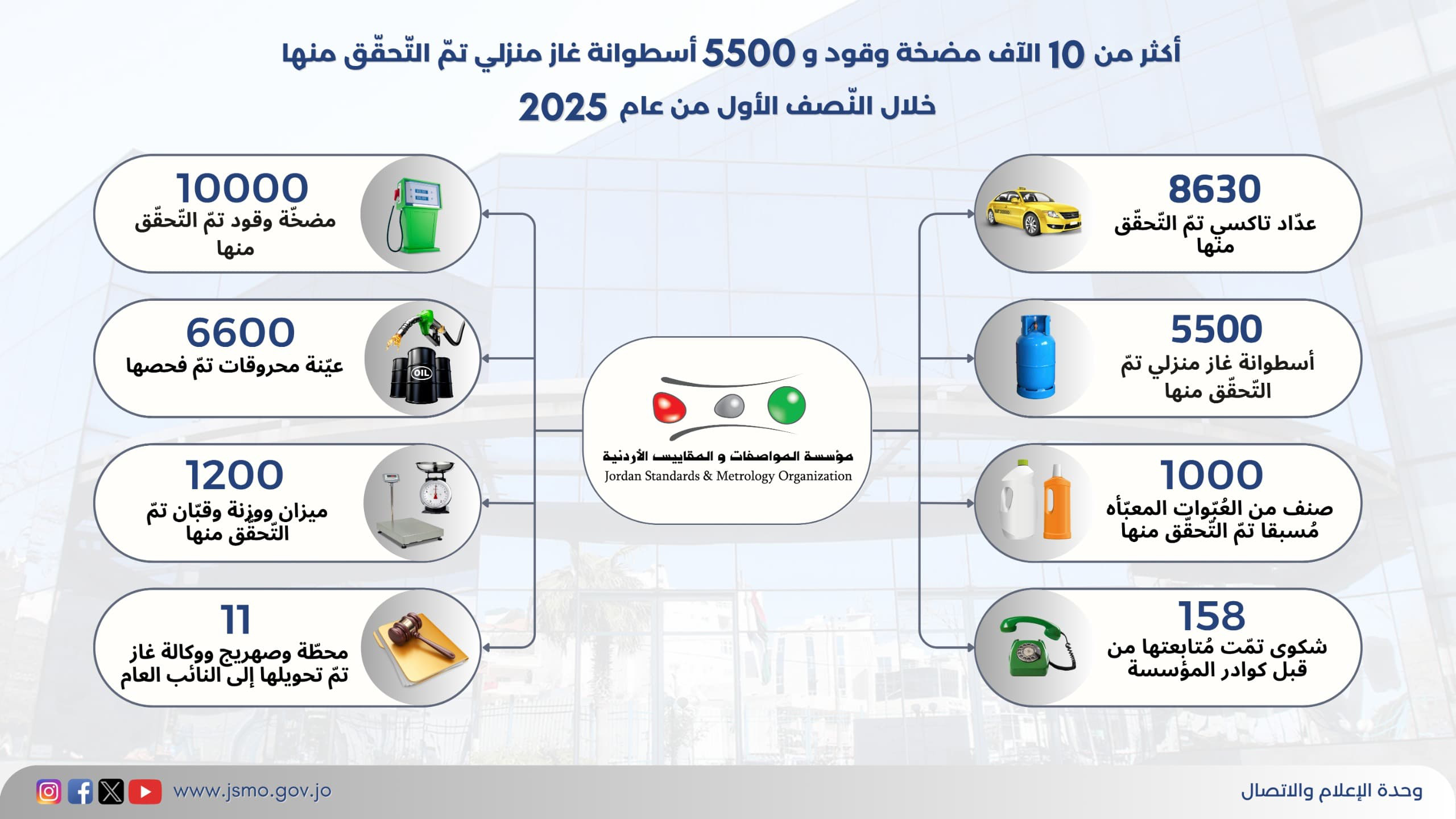 وبيَّنت المؤسسة أن كوادرها الرقابية نفّذت جولات تفتيشية فجائية ودورية على جميع المحافظات، شملت التحقق من أكثر من 10,000 مضخة تزويد بالمحروقات، و5500 أسطوانة غاز منزلي، كما تم سحب ما يزيد عن 6000 عينة من محطات المحروقات لفحصها مخبريًا، إلى جانب فحص 600 عينة من البواخر القادمة عبر ميناء العقبة قبل السماح بتفريغ حمولتها للتأكد من مطابقتها للقواعد الفنية الخاصة بها.