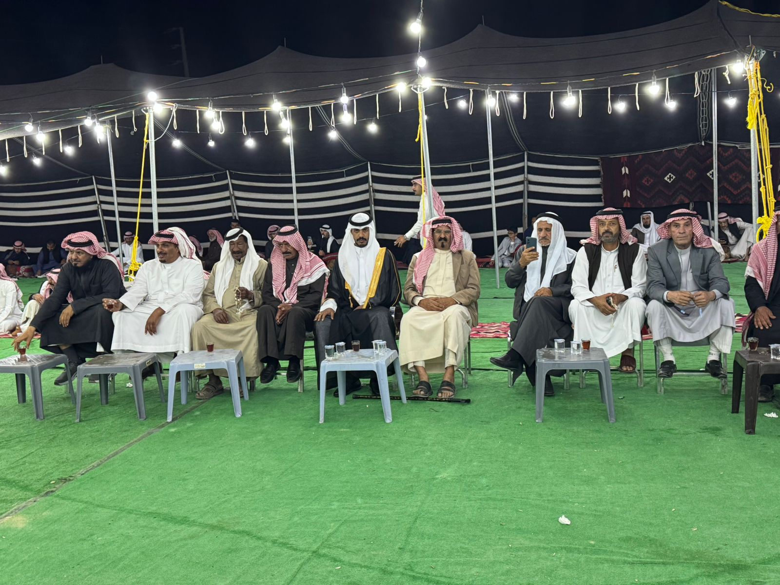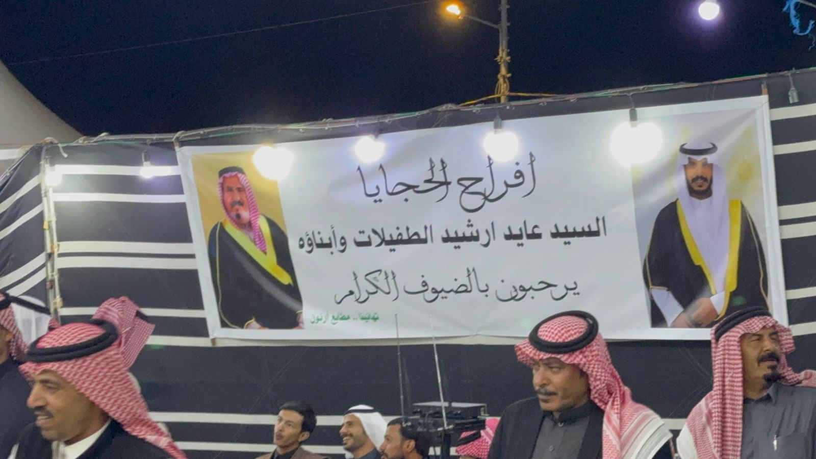 الشعراء عندما حضروا بيت الفرح ، فقد اعتلوا المنصة الشعرية التي حضرها والد العريس و بحضور مشرف ومهيب من مدعوين مهتمين ، وسط تصفيق وترحيب وتهاني للعريس ووالده واخوانه .