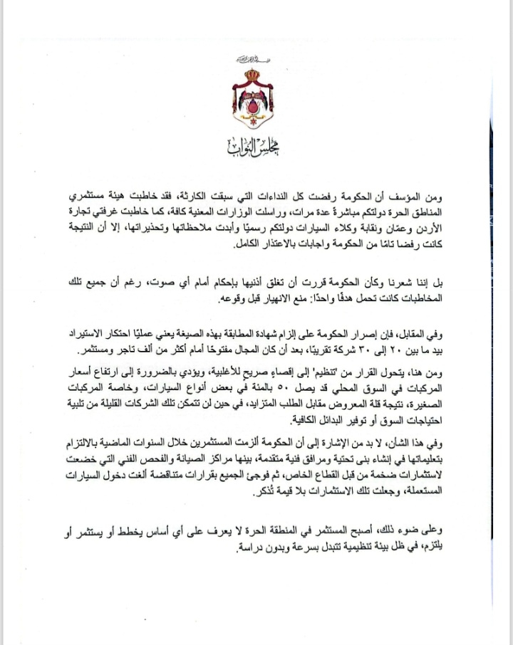 وقال النائب البستنجي، بحسب المذكرة، إن القرار فُرض دون دراسة واقعية كافية، فشهادات المطابقة المطلوبة غير متوفرة في ويستحيل إصدارها، مضيفًا أن القرار "سيغلق فعليًا أبواب المنطقة الحرة أمام حركة المركبات والنشاط التجاري.