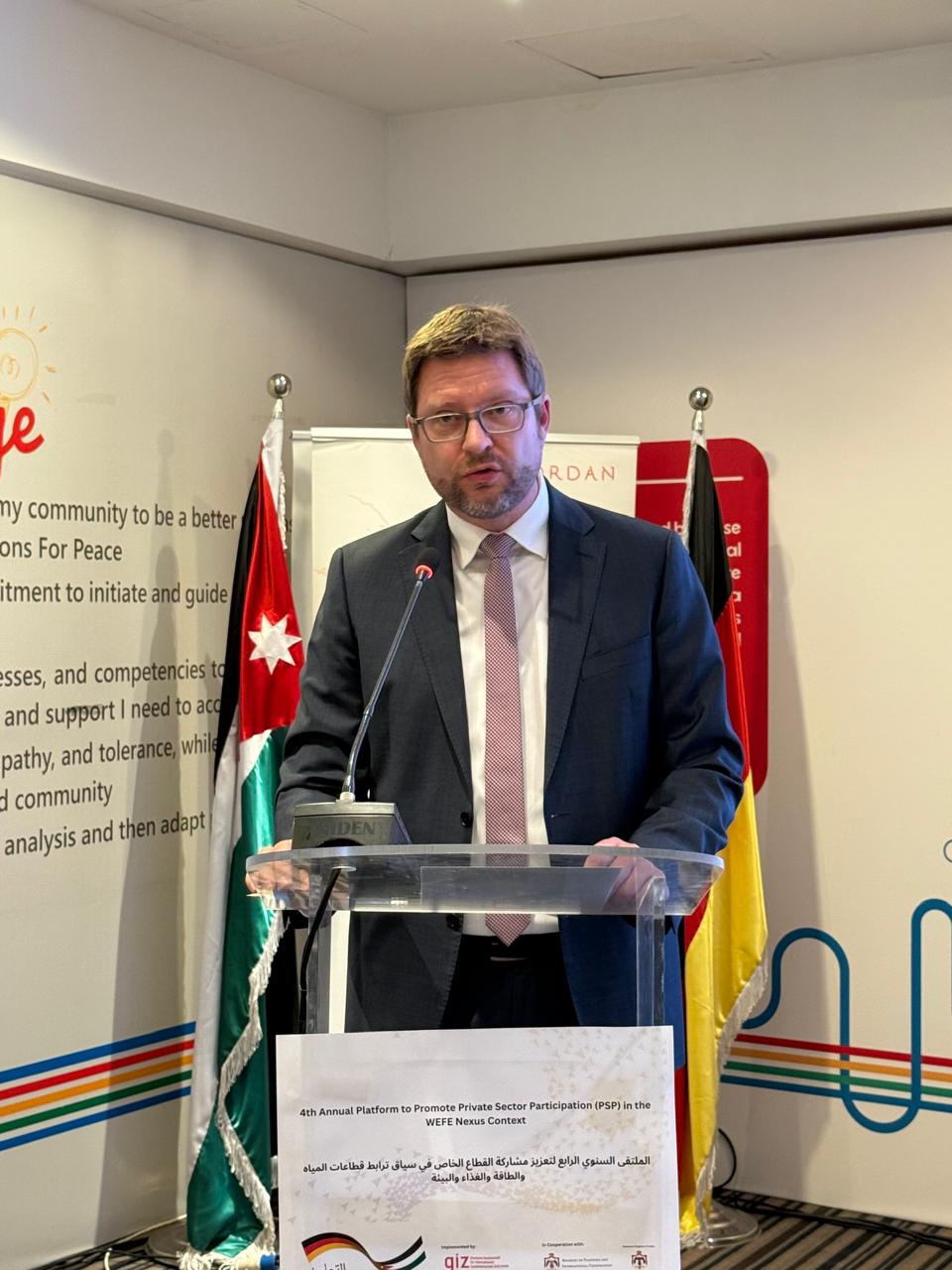 السيد ماريوس راو مدير التعاون الدولي في السفارة الألمانية استعرض عددا من التحديات والتغيرات المناخية مؤكدا ضرورة تعزيز الروابط بين القطاعات المشار اليها بالشراكة مع القطاع الخاص.