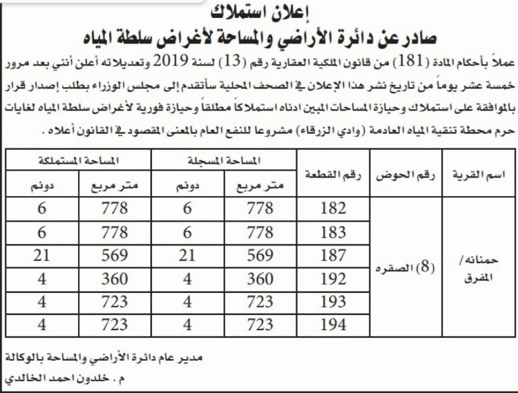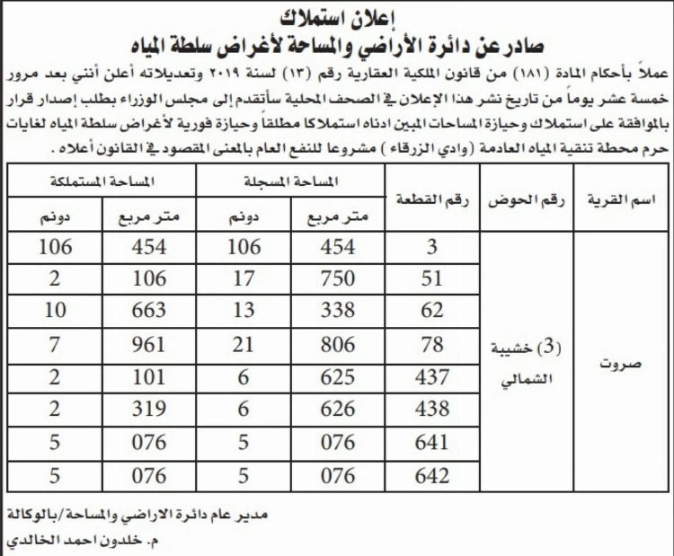أعلنت دائرة الأراضي والمساحة اليوم الثلاثاء عن نيتها التقدّم بطلب إلى مجلس الوزراء للموافقة على استملاك وتخلي عن مساحات من عدد من قطع الأراضي استملاكًا مطلقًا مع حيازة فورية، وذلك لخدمة مشاريع سلطة المياه.