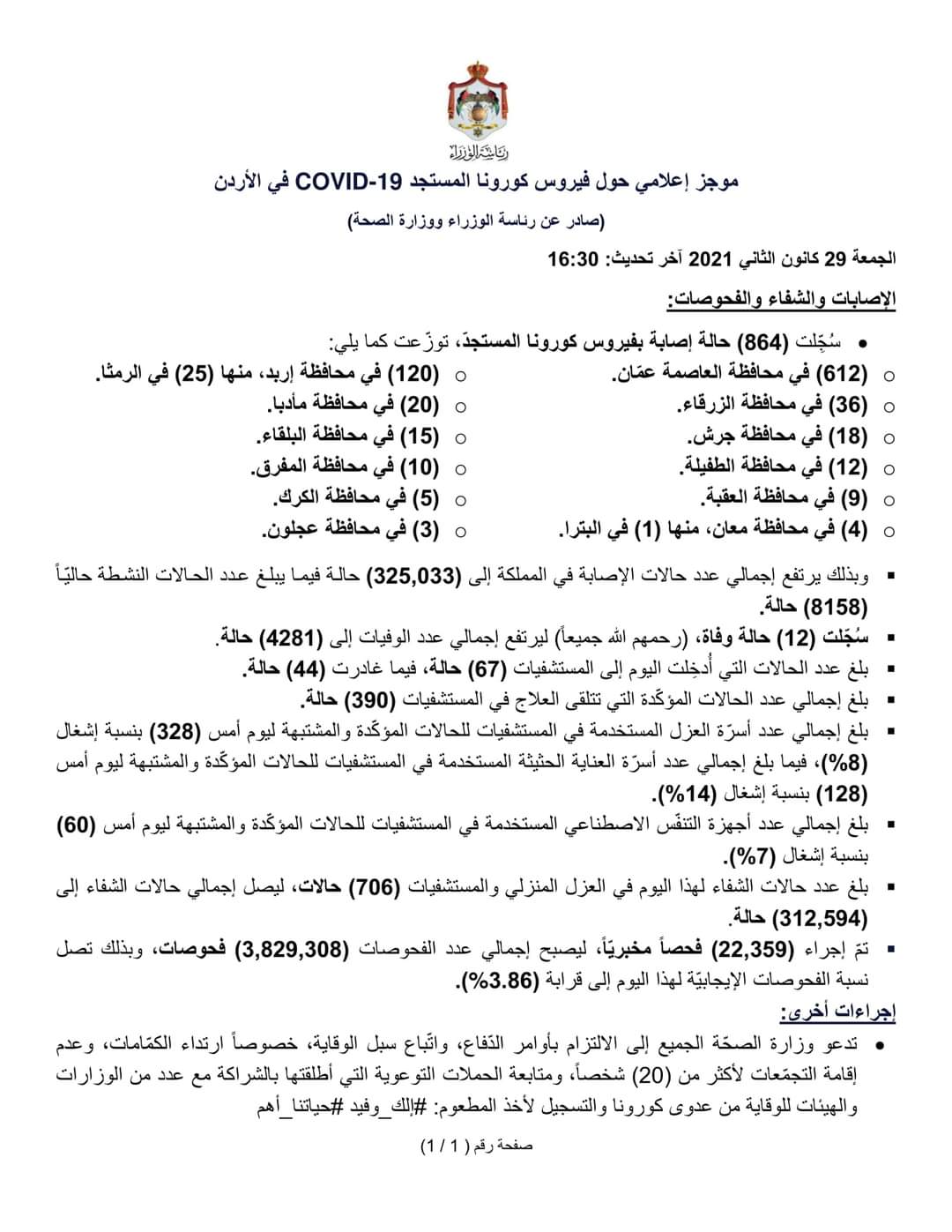 أخبار الأردن:سجل في المملكة اليوم 12حالة وفاة و864 إصابة بفيروس كورونا