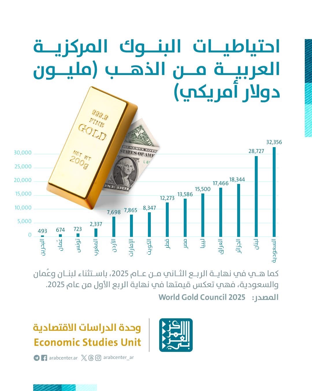 رصد خاص - نشرت وحدة الدراسات الاقتصادية التابعة للمركز العربي للأبحاث ودراسة السياسات إنفوجرافين جديدين يسلطان الضوء على حجم احتياطات الذهب في البنوك المركزية للدول العربية، استنادًا إلى بيانات مجلس الذهب العالمي (World Gold Council) لعام 2025. ويقارن الإنفوجرافان بين حجم الاحتياطات من حيث القيمة (بالمليار دولار أمريكي) ومن حيث نسبتها المئوية من إجمالي الاحتياطيات الأجنبية الرسمية لكل دولة. وتشير البيانات المُستخدمة إلى نهاية الربع الثاني من عام 2025، باستثناء لبنان وسلطنة عُمان والمملكة العربية السعودية، التي تعكس قيمتها نهاية الربع الأول من العام ذاته.