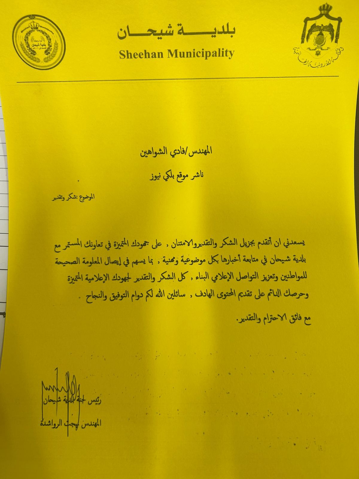 الكرك – وجه رئيس لجنة بلدية شيحان، المهندس بهجت الرواشدة، كتاب شكر وتقدير لموقع "بلكي نيوز" ، تقديراً للدور الإعلامي البارز والمهني الذي يقوم به