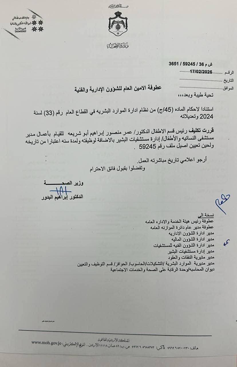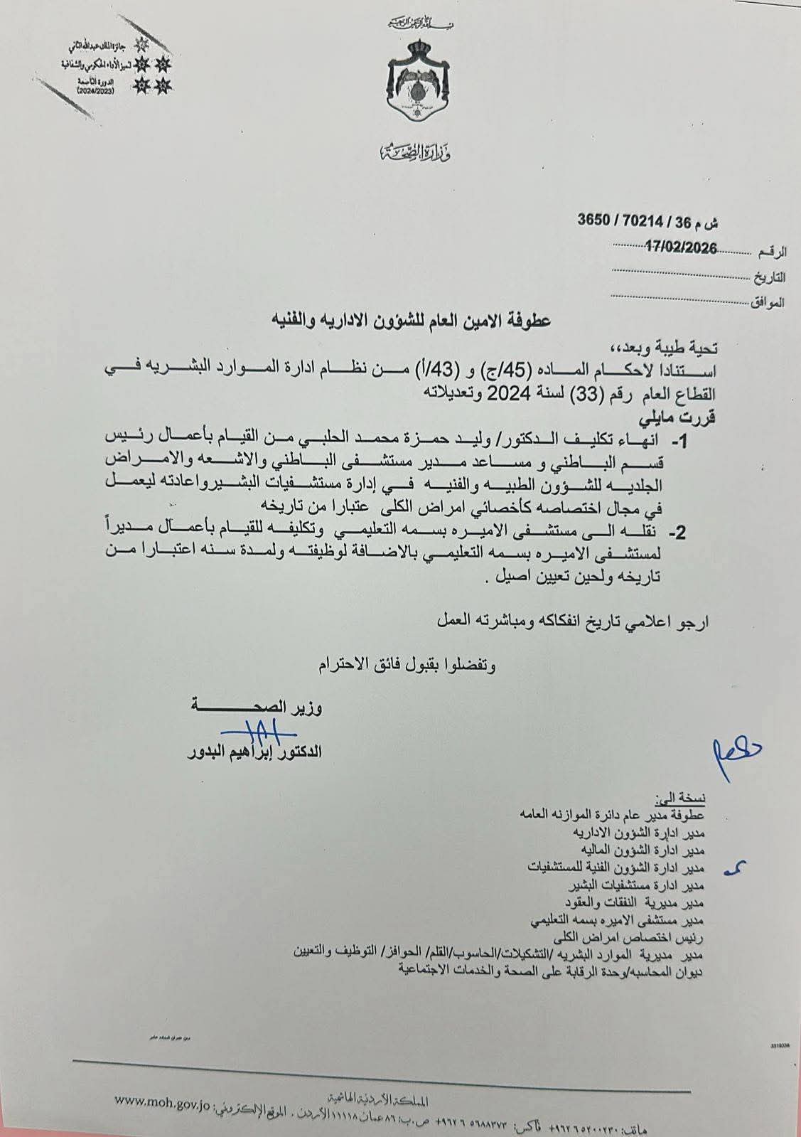 وبحسب مصادر مطلعة، فإن التغييرات الأخيرة لم تقتصر على تنقلات إدارية تقليدية، بل استندت إلى معايير تتعلق بالكفاءة والإنجاز والقدرة على إدارة الملفات الميدانية، بما يضمن تسريع وتيرة العمل وتحسين جودة الخدمات الصحية المقدمة للمواطنين في مختلف محافظات المملكة.