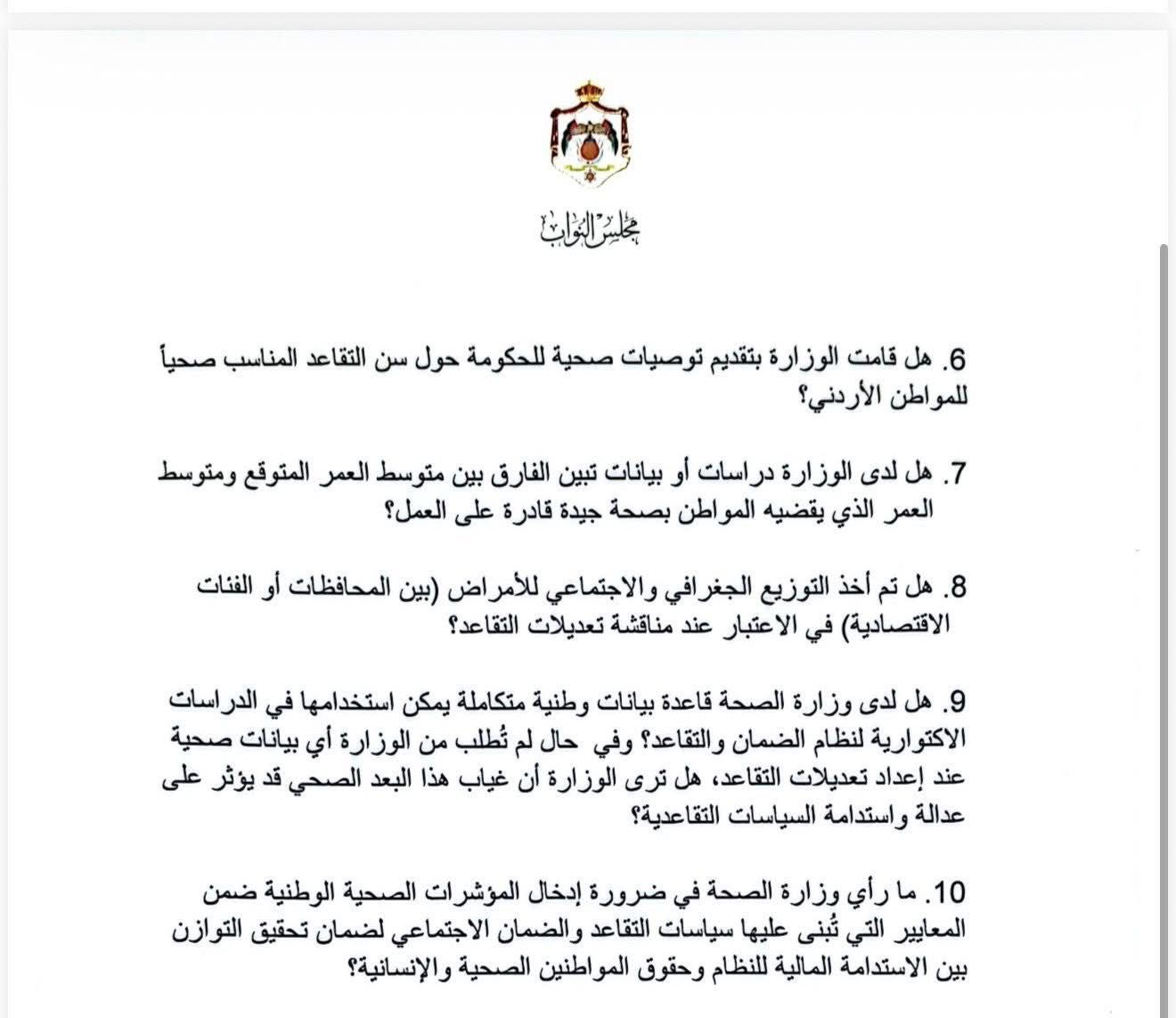 وفي هذا الإطار، استفسرت النائب عما إذا كانت وزارة الصحة قد زودت الحكومة ببيانات محدثة حول الحالة الصحية العامة، أو بمتوسط "العمر الصحي" للمواطن الأردني ليتم استخدامه في الدراسات الاكتوارية، كما طالبت بمعرفة ما إذا قدمت الوزارة تحليلاً لانتشار الأمراض المزمنة مثل السكري وأمراض القلب والجهاز التنفسي، ومدى تأثيرها على قدرة العاملين على الاستمرار في وظائفهم حتى سن التقاعد الجديد، إلى جانب مدى شمولية التقييم ليشمل تأثير طبيعة المهن الشاقة على صحة العاملين.
