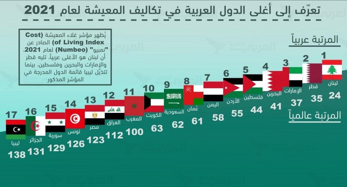 أظهر مؤشر غلاء المعيشة (Cost of Living Index)، الصادر عن "نمبيو" (Numbeo)، للعام 2021، أن لبنان هو الأغلى عربياً تليه دولة قطر والإمارات والبحرين وفلسطين، بينما تتذيّل ليبيا قائمة الدول المدرجة في المؤشر المذكور.