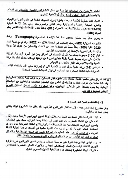 وعن تطوير الموارد البشرية، بين ابتعاث 151 طالب من مختلف التخصصات المطلوبة حيث تحملت الهيئة نفقات معيشتهم فقط، فيما تكفلت الدول التي ابتعث الطلبة إليها برسوم الدراسة الجامعية، إضافة إلى ابتعاث عدد من طلبة البادية الوسطى إلى جامعة العلوم والتكنولوجيا على نفقتها، مشيرا إلى انهاء عديدهم للدراسة والتحاقهم للعمل في الهيئة، ولفت إلى أن عدد العاملين في مشاريع البرنامج النووي الأردني في الهيئة بحدود 300 موظف.