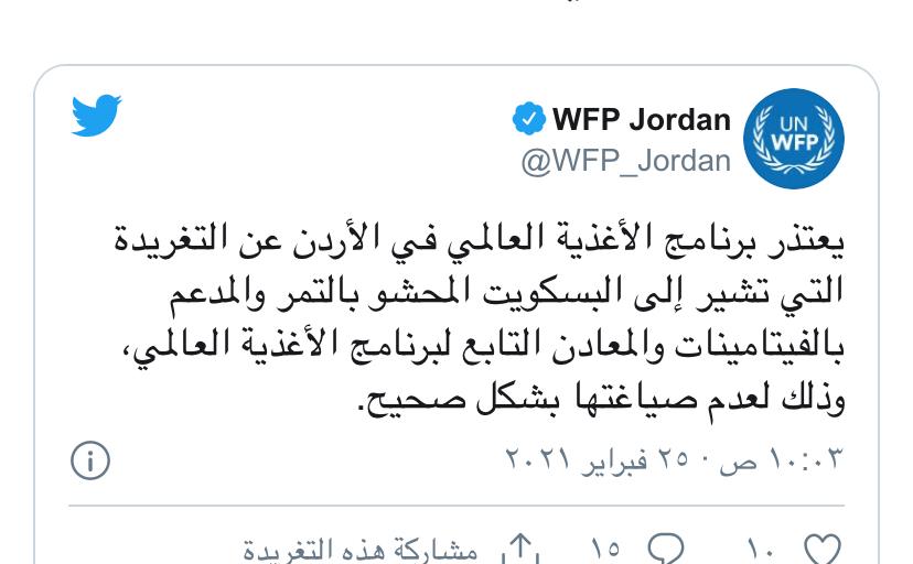 ونشر برنامج التغذية بعد حذف التغريدة الأولى: "يعتذر برنامج الأغذية العالمي في الأردن عن التغريدة التي تشير إلى البسكويت المحشو بالتمر والمدعم بالفيتامينات والمعادن التابع لبرنامج الأغذية العالمي، وذلك لعدم صياغتها بشكل صحيح".