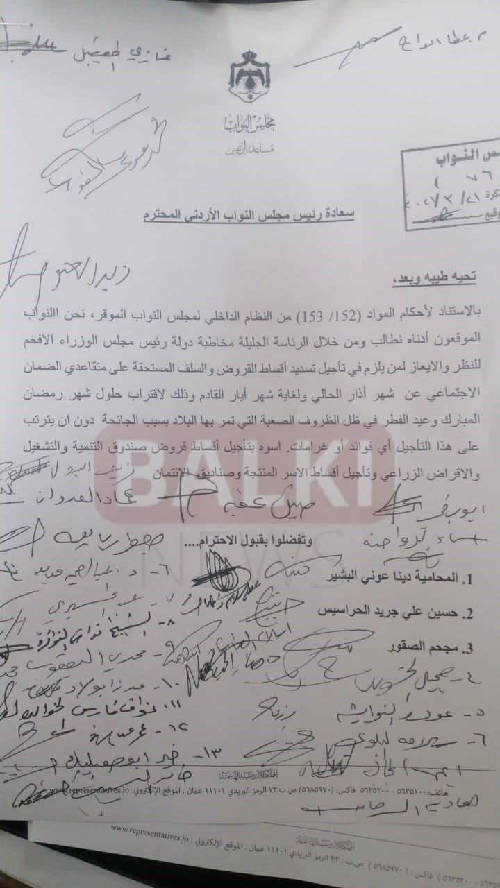 تبنت النائب المحامية دينا البشير مذكرة نيابية وقع عليها عدد من النواب تطالب رئيس الحكومة بتأجيل تسديد اقساط القروض والسلف القائمة على متقاعدي الضمان الاجتماعي لمدة ثلاثة شهور ( اذار ونيسان وايار) نظرا للظروف الاقتصادية الصعبة التي تمر بها البلاد بسبب جائحة كورونا اضافة الى اقتراب موعد شهر رمضان المبارك وعيد الفطر السعيد .