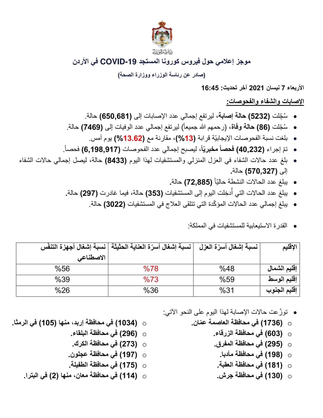 • سُجِّلت (5232) حالة إصابة، ليرتفع إجمالي عدد الإصابات إلى (650,681) حالة.