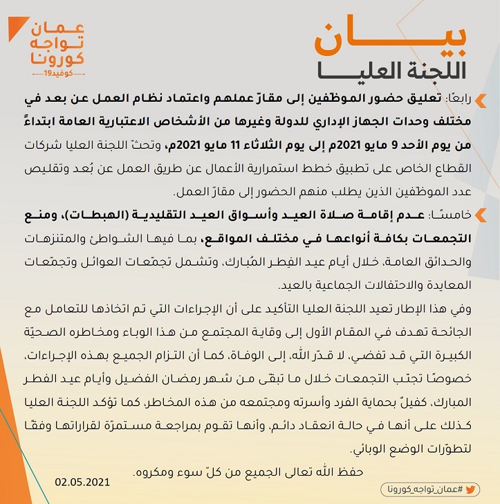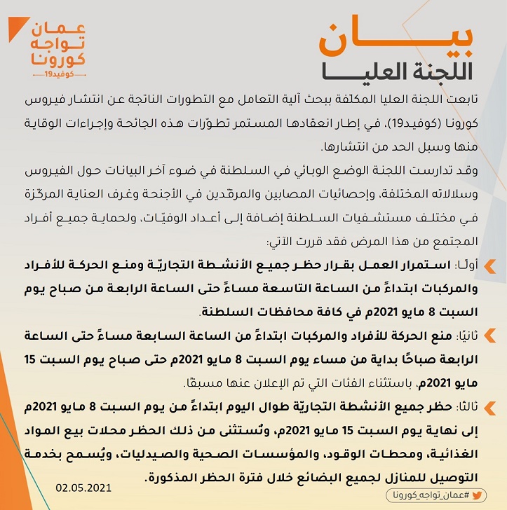 أعلنت سلطنة عمان حظر حركة الأفراد والمركبات من الساعة الـ7 وحتى الـ4 فجرا، اعتبارا من يوم السبت القادم وحتى 15 مايو ضمن إجراءات كورونا.