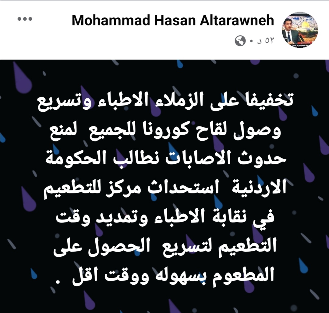 طالب الدكتور محمد حسن الطراونة أخصائي الامراض الصدرية والتنفسية والحساسية وامراض النوم والعناية الحثيثة من خلال منشور على صفحته على موقع التواصل الاجتماعي فيس بوك استحداث مركز للتطعيم في نقابة الاطباء وتمديد وقت التطعيم لتسريع الحصول على المطعوم بسهوله ووقت اقل وذلك للتخفيف على الاطباء وتسريع وصول لقاح كورونا للجميع لمنع حدوث الاصابات.