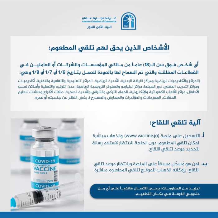 تجارة عمان تعلن آلية واماكن استقبال الافراد للتطعيم ضد كورونا للقطاعات المغلقة